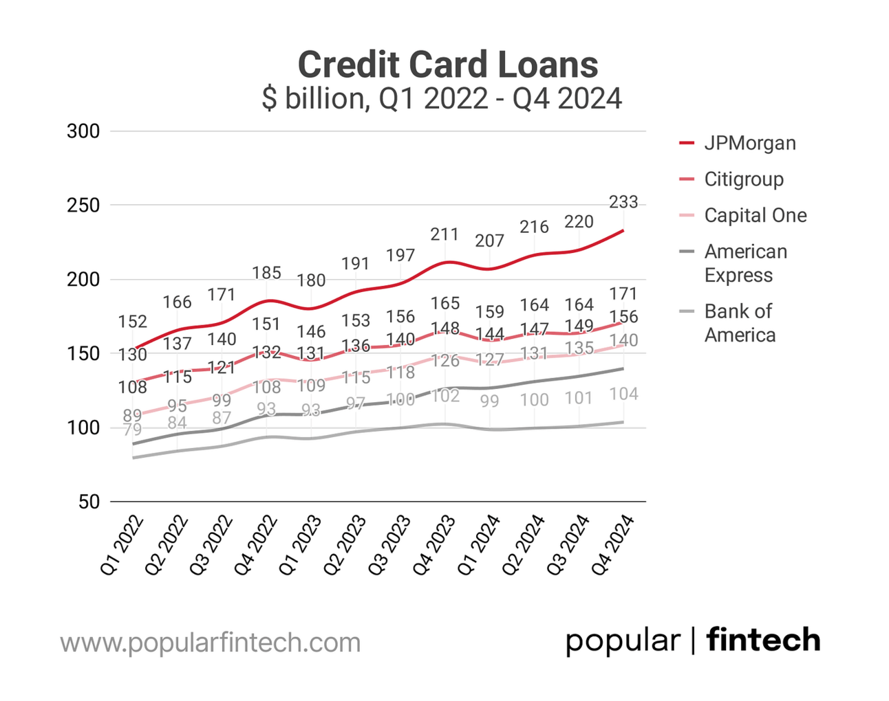 JPMorgan finished 2024 with $233 billion in credit card loans (up from $152 billion three years ago), Citigroup with $171 billion (up from $130 billion), and Capital One with $156 billion (up from $108 billion).
