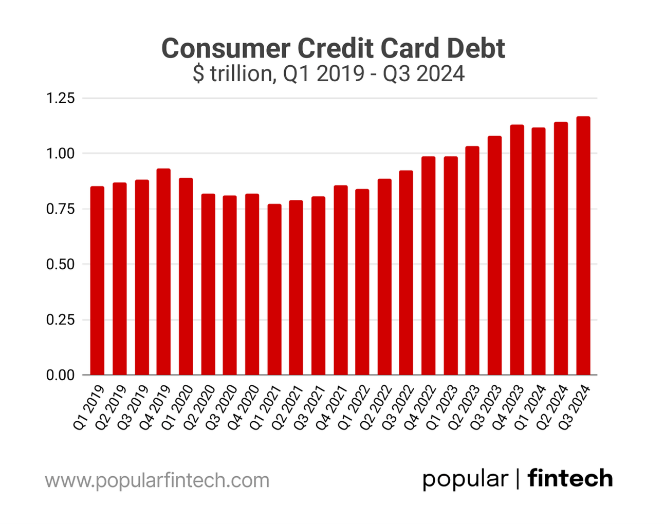 Again, the last few years were ideal for building a credit card business as loan balances exploded. The outstanding consumer credit card debt bottomed at around $0.77 trillion at the beginning of 2021, and then rapidly grew to $1.17 trillion at the end of Q3 2024. And Fintech companies did nothing about it.