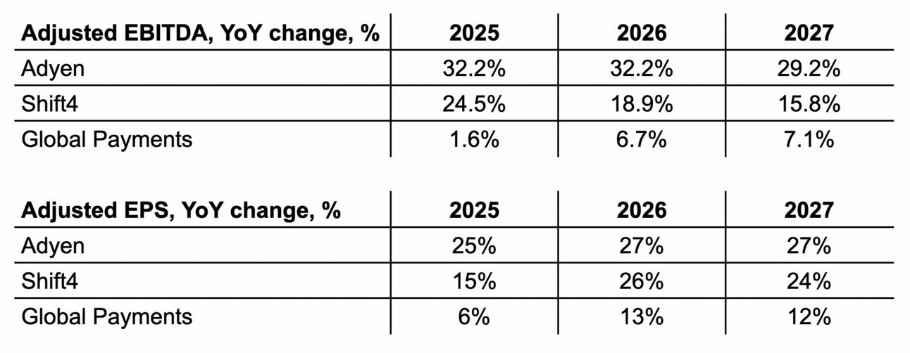 But if Shift4 looks (and grows) more like Adyen going forward, why does it trade at a lower multiple? And it looks like analysts don’t actually believe that Shift4 can deliver on their growth targets. Analysts expect Shift4's Adjusted EBITDA growth to fall to 15% in 2027. The same analysts don’t question Adyen’s ability to deliver on growth targets.