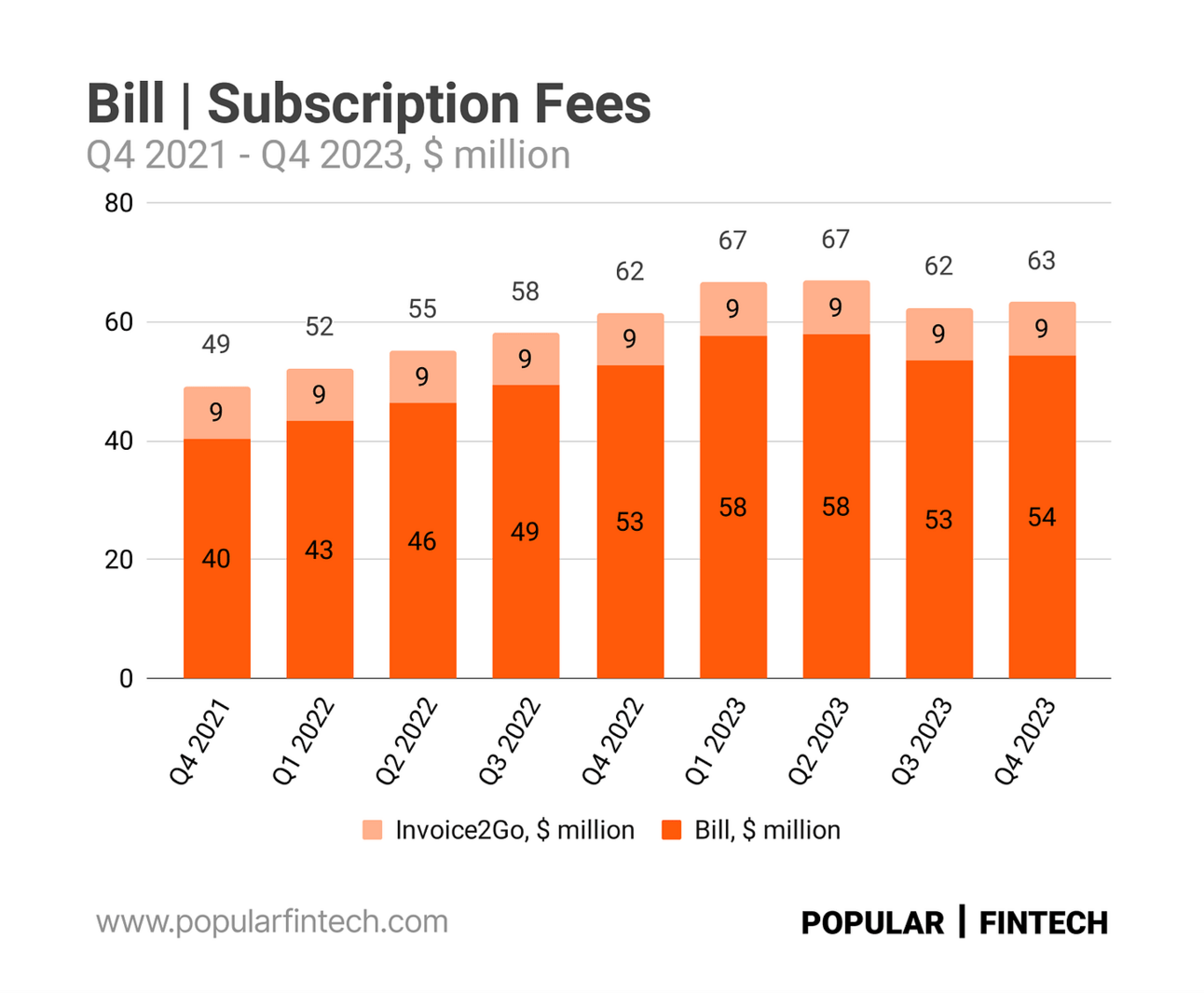 Bill charges $45-79 per user per month for its platform. In 2023, subscription fees for Bill’s platform contributed $223 million to the company’s top line. In addition, in 2021, Bill acquired Invoice2Go, an invoicing and expense-tracking solution, which brought in an additional $36 million in revenue.