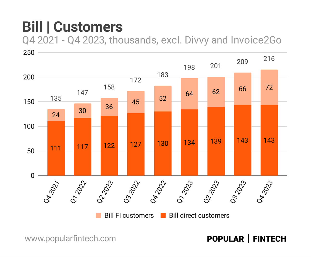 Per Bill's management comments, most of the company’s financial institution partners offered only ACH and check payments to the customers using Bill’s white-labeled platform. Thus, in addition to financial institution customers making relatively few payments (compared to Bill’s direct customers), they also use the products with the lowest take rate (Bill’s average take rate is 0.14%, take rate on card payments is 2.9%).