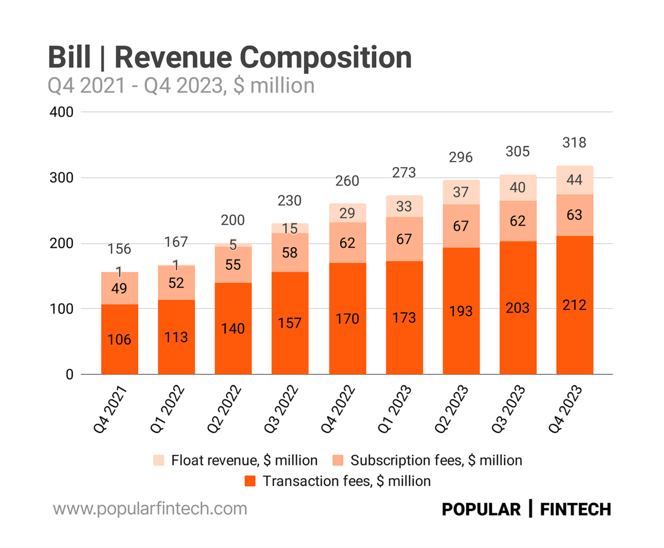 Before I try to answer this question, let’s take a step back and look into how Bill makes money. It has three sources of revenue: 1) transaction fees, or fees that its customers pay for payment processing, 2) subscription fees, which are monthly fees for using Bill’s platform, and 3) float revenue, or the interest that the company earns on customer funds.