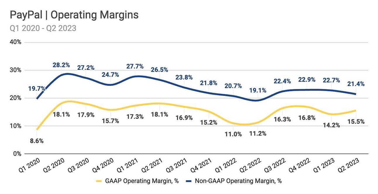 PayPal (NASDAQ: PYPL) reported its second-quarter 2023 results on Wednesday. Total payment volume rose 11% YoY to $376.5 billion, resulting in a 7% YoY increase in net revenue to $7.3 billion. The company's GAAP operating income was $1.1 billion, up 48% YoY and non-GAAP operating income was $1.6 billion, up 20% YoY. GAAP EPS was $0.92 compared to negative $0.29 in the second quarter of 2023, and non-GAAP EPS at $1.16 compared to $0.93 a year ago. The company expects full-year 2023 GAAP EPS to be $3.49 and non-GAAP EPS to be $4.95, representing a 67% YoY and 20% YoY increase respectively.