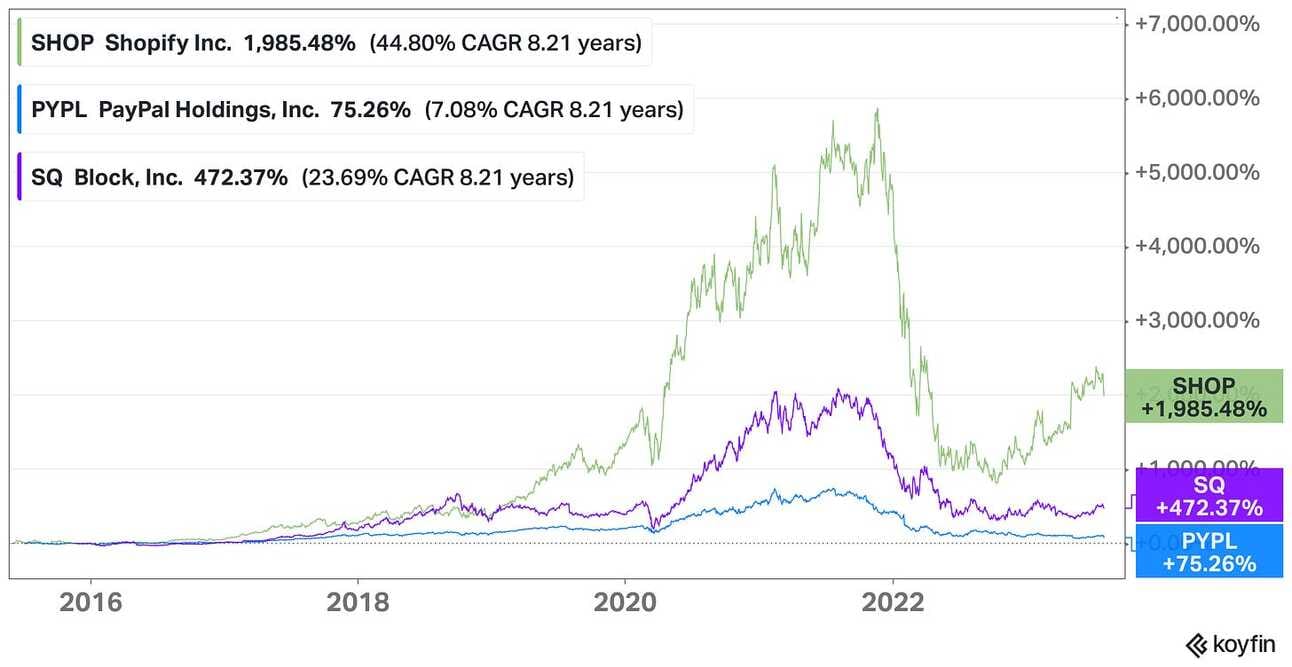 If you could go back in time and invest only in one company covered in today’s newsletter, you’d rather choose Shopify. Thus, Shopify stock is up 1,985% since its first day of trading, compared to +472% for Block, and 75% for PayPal.