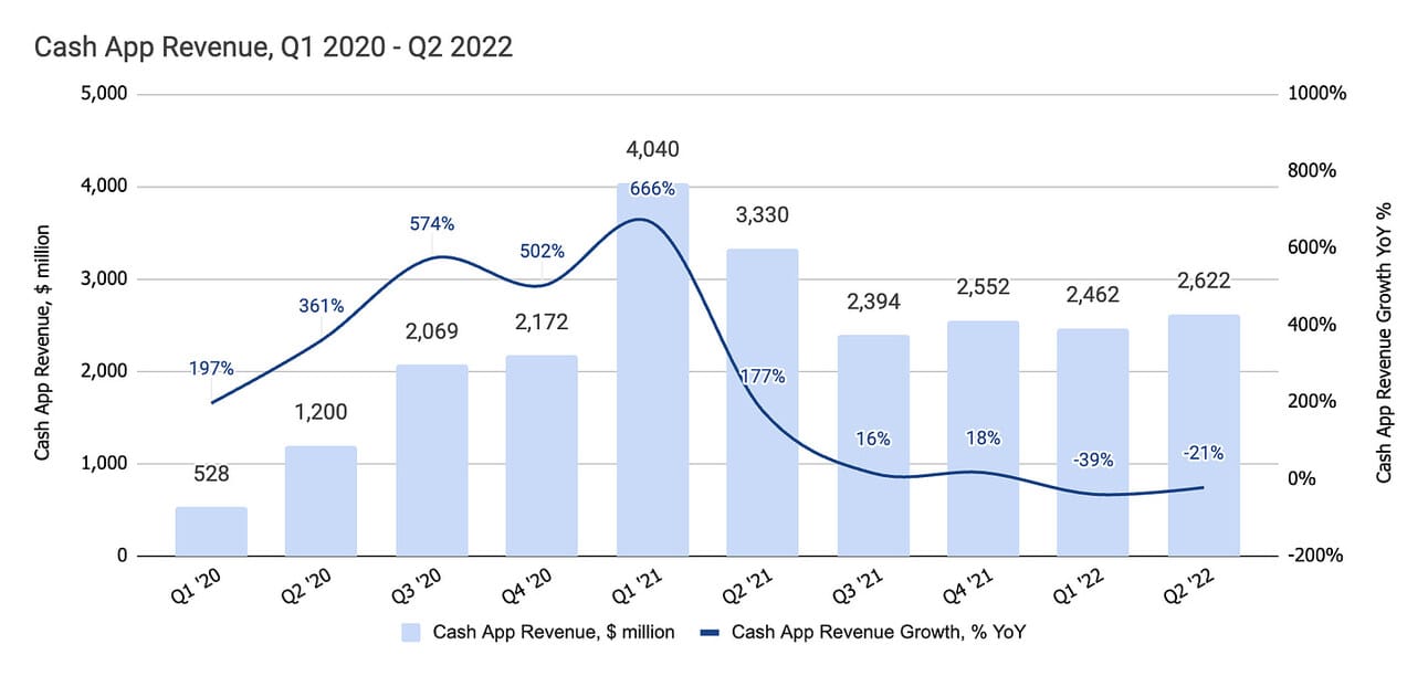Cash App generated $2.62 billion in revenue in Q2 2022, which represents a decline of 21% compared to Q2 2021. As argued previously, one should look at Cash App performance excluding Bitcoin revenue. My reasoning is that Bitcoin revenue is highly volatile, driven by market sentiment (read price of Bitcoin), and makes less than 3% gross profit contribution.