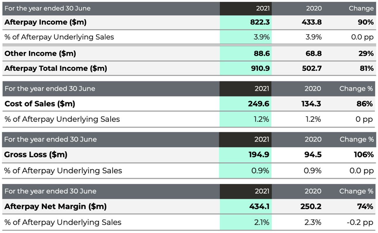 The tables below show the last full fiscal year results of Afterpay as an independent company (year ended June 30, 2021). Please note that the values are in Australian dollars. As you can see, the company measured sales as a % of underlying sales (you can think of this percentage as the Take rate), and the two core cost items were a) cost of sales (i.e. processing repayments), and b) gross loss (loss resulting from customers defaulting on their obligations).