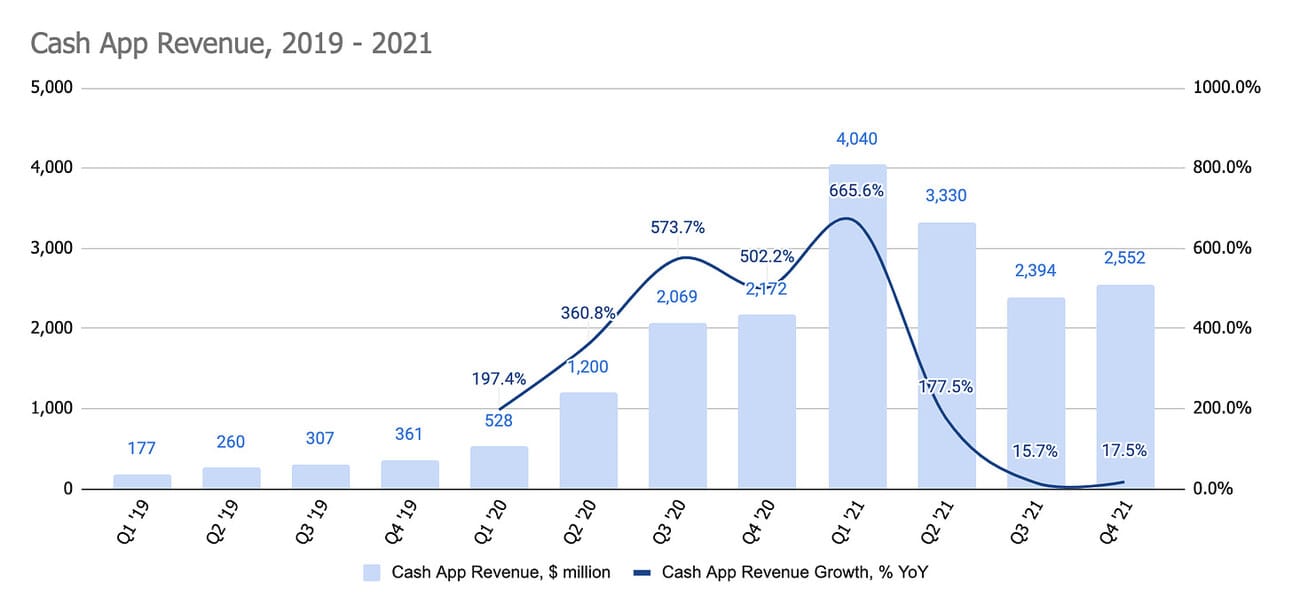 The company reported over 44 million Cash App Monthly Active customers at the end of 2021 (up from 36 million at the end of 2020, and 24 million at the end of 2019), of which 13 million were using Cash Card every month (“Monthly Cash Card Actives”). The company also boasts an average Customer Acquisition Cost for Cash App at approximately $10 in 2021.