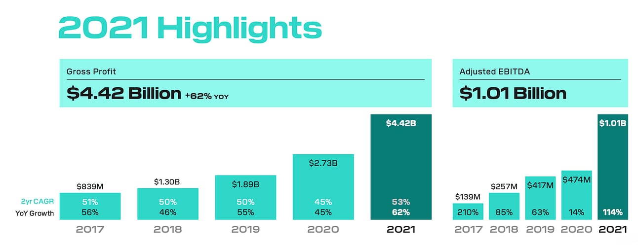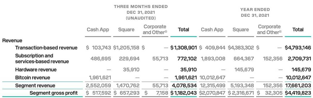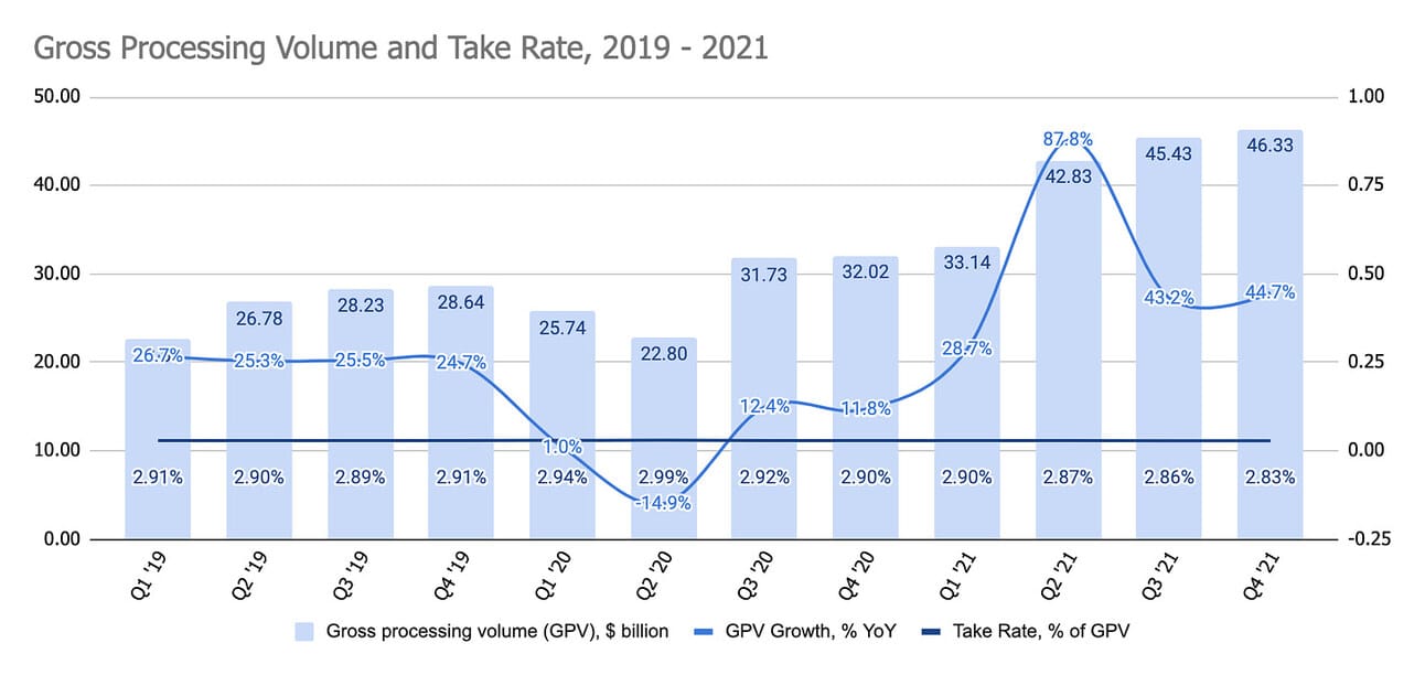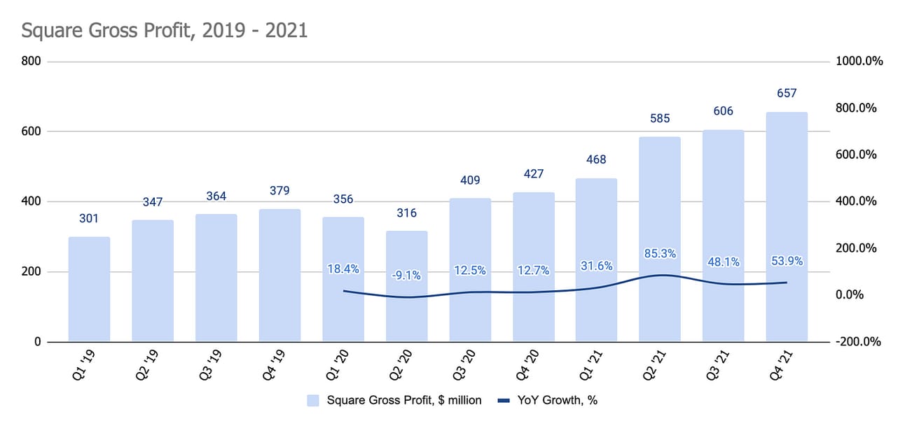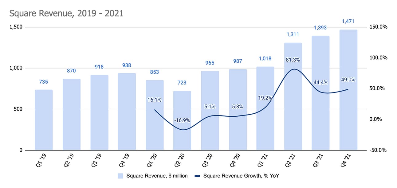 Last year the company also acquired Afterpay, one of the largest BNPL players globally; however, the acquisition was completed in early 2022; thus, 2021 financials do not include this business (you can learn more about the Afterpay scale here). In addition, the company also acquired a majority stake in TIDAL, a music streaming service in 2021; however, per the company’s filling “TIDAL did not have a material impact on the Company's condensed consolidated financial statements”.