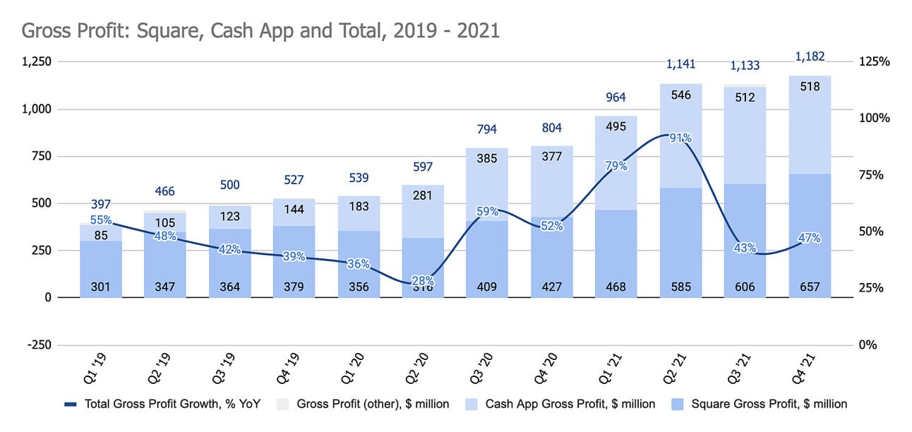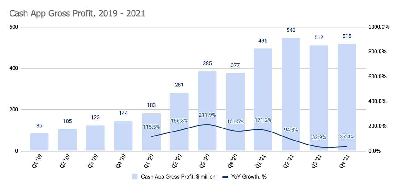 As I argued above, Bitcoin trading generates lots of revenue for Cash App, but given the low margins and unpredictability of volumes for this service, I would look at it separately from the rest of the Cash App business. As you can see below, Gross Profit generated by Bitcoin trading spiked during 2020 - 2021, but has been decreasing since its peak in Q1 2021. Overall, the Bitcoin trading service generated 10.5% of Cash App’s Gross Profit in 2021.