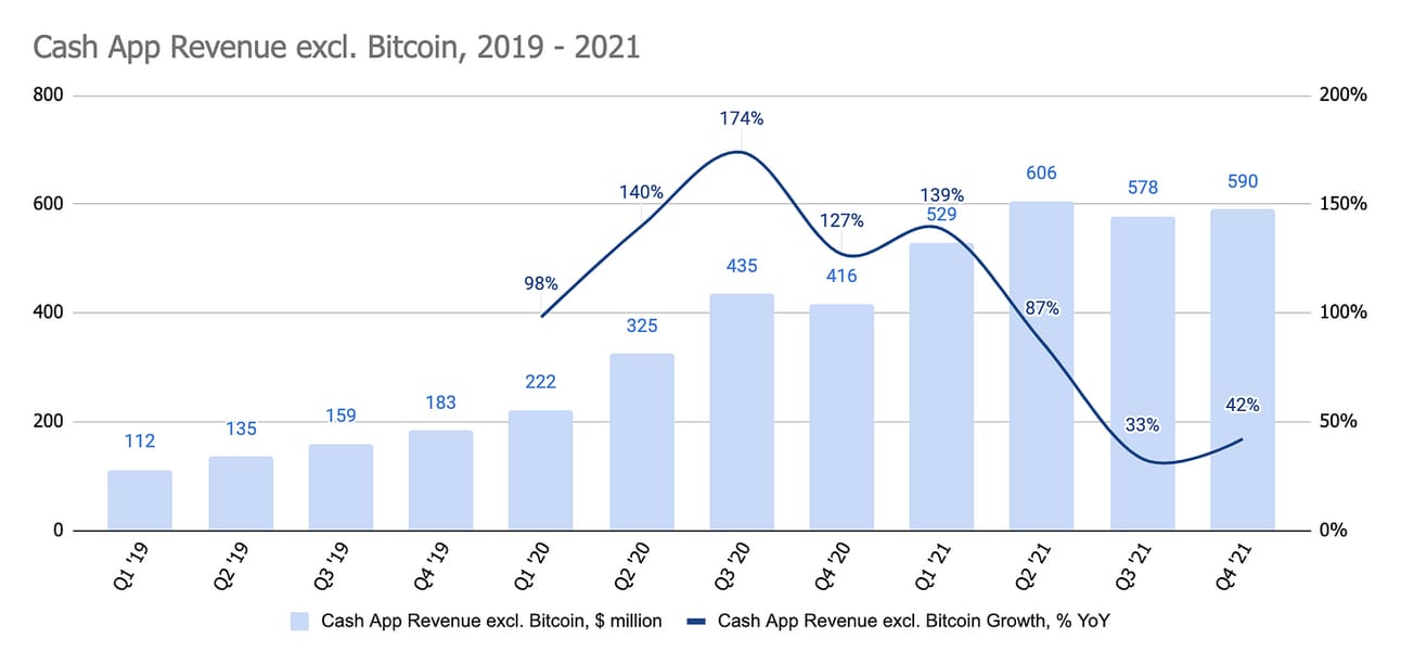 Cash App excl. Bitcoin. I am extremely excited about 80%+ gross margins of Cash App business (excluding Bitcoin), and I totally understand why the company is investing heavily into the growth of Cash App user base. My concern is that it already boasts 44 million active monthly customers, so the question is how far it can go?