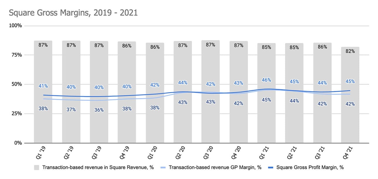 Square (“Seller” in the table above) generates most of its revenue by charging merchants a fee for processing payments (“Transaction-based revenue”). In addition, it makes money from such services as Square Loans, software subscriptions, and Instant Transfers for merchants (“Subscription and services-based revenue”). Finally, it sells and leases POS terminals and cash registers (“Hardware revenue”). In 2021, Square generated 29% of the company’s revenue, and 52% of the company’s gross profit (revenue less directly attributable costs, i.e. card scheme costs and “interchange” fees).
