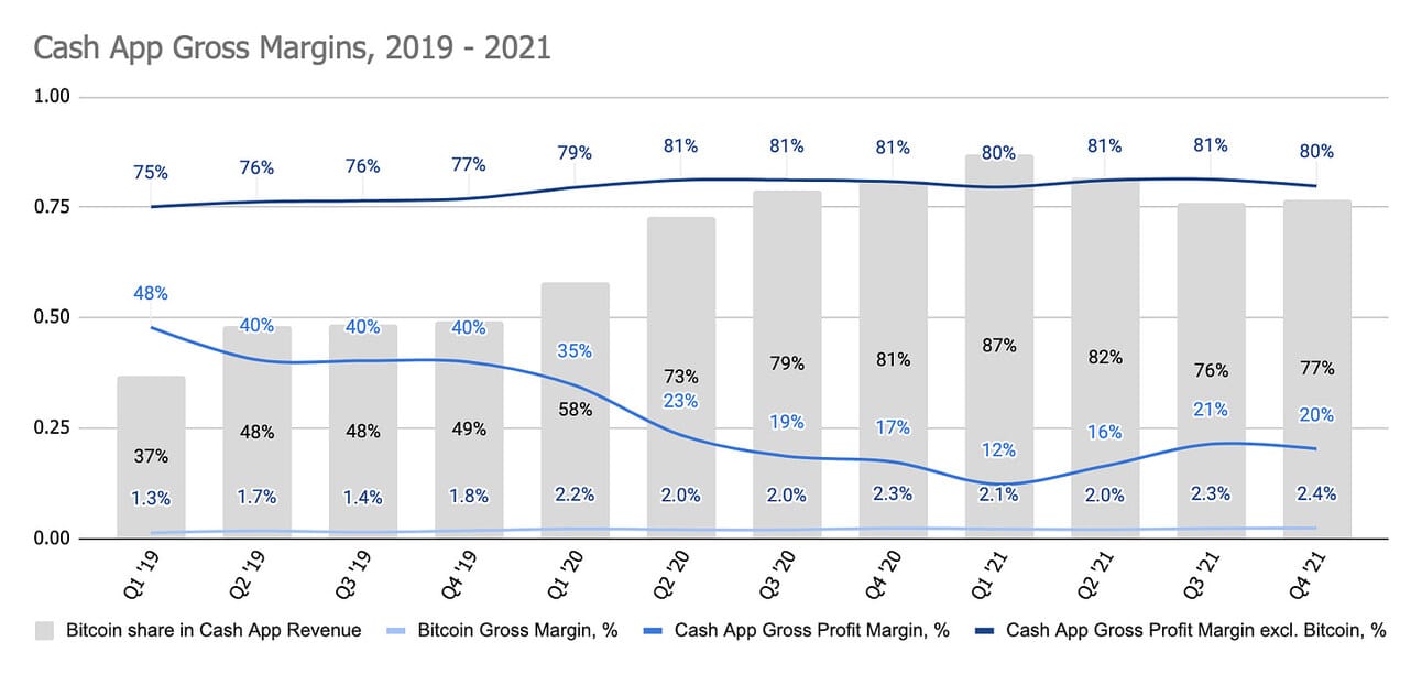 However, this is not Bitcoin that I wanted to illustrate with this chart, but the 80%+ gross margin that Cash App earns on the rest of its services. Forget about Bitcoin for a second: Cash App booked $2.3 billion in revenue excluding Bitcoin trading in 2021 and generated an 81% gross margin on this revenue.