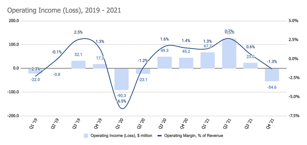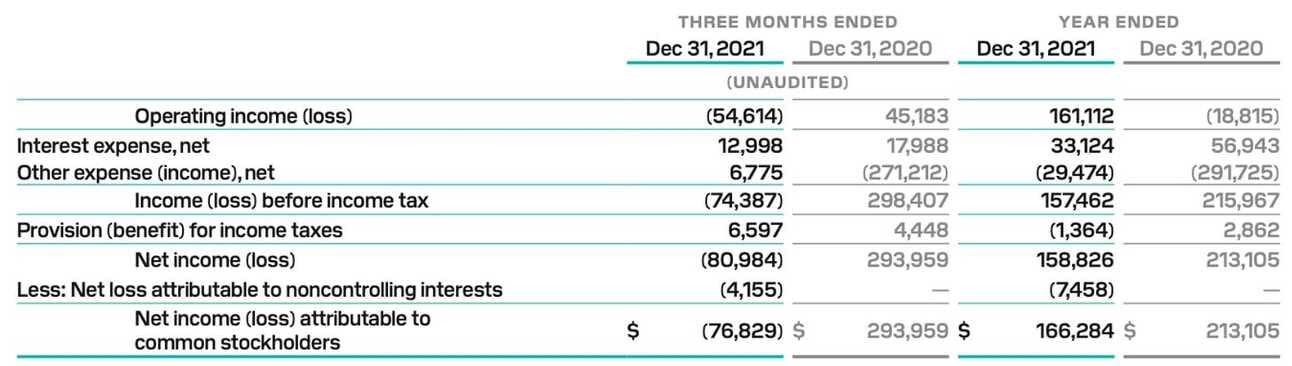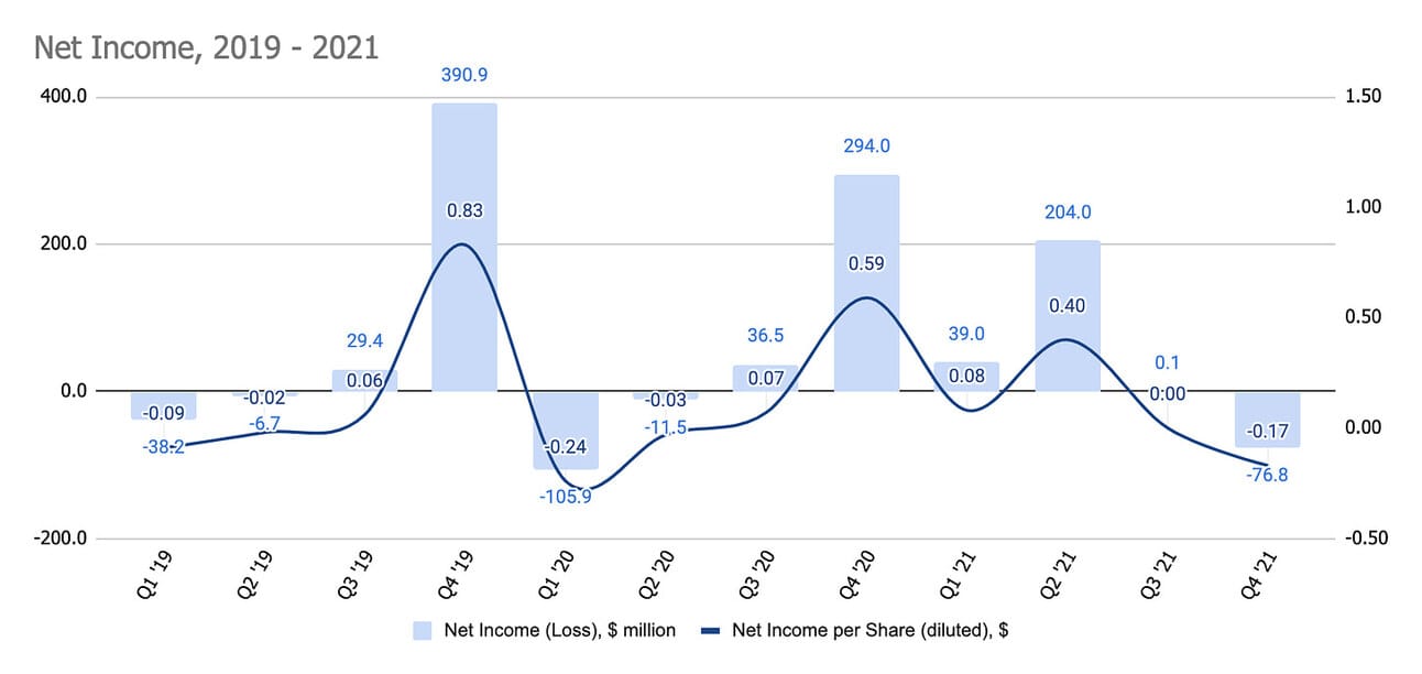 The company reported Net loss of $76.8 million for Q4 2021 (down from Net income of $293.9 in Q4 2020), and Net income of $166.3 million for the full year 2021 (down from Net income of $213 million for the full year 2020).