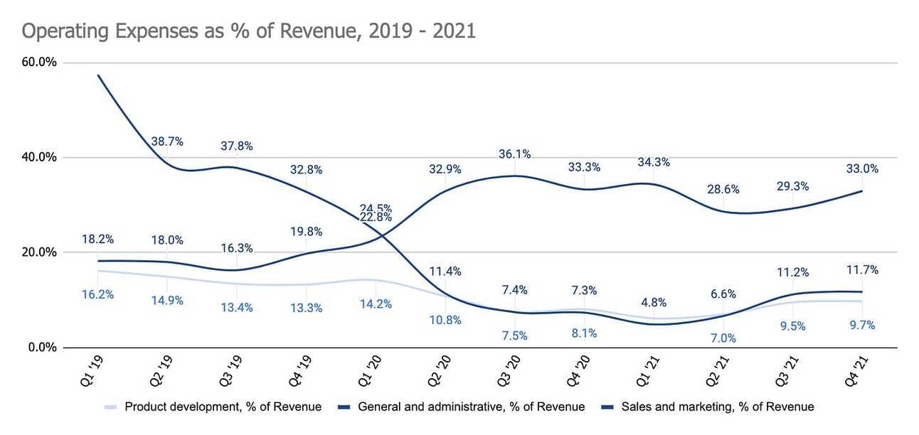 Block reported $54.6 million in Operating loss in Q4 2021 (down from $45.2 million income in Q4 2020), and $161.1 million in Operating income for the full year 2021 (up from $18.8 million loss in 2020). The company’s key operating expenses in 2021 were “Sales and marketing” (38% of total operating expenses), “Product development” (33%), and “General and administrative” (23%).