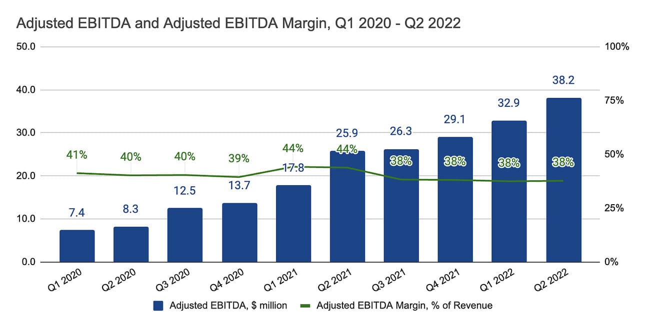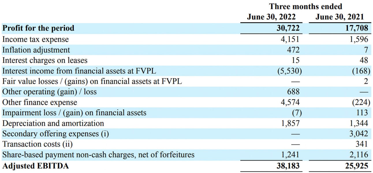 The company also reported an Adjusted EBITDA of $38.2 million for the quarter, which represents a 47.5% increase compared to Q2 2021. The company calculates the Adjusted EBITDA by adjusting the profit for the period by depreciation and amortization, income taxes, as well as interest income and expenses on financial assets (i.e. investing company’s cash balance).