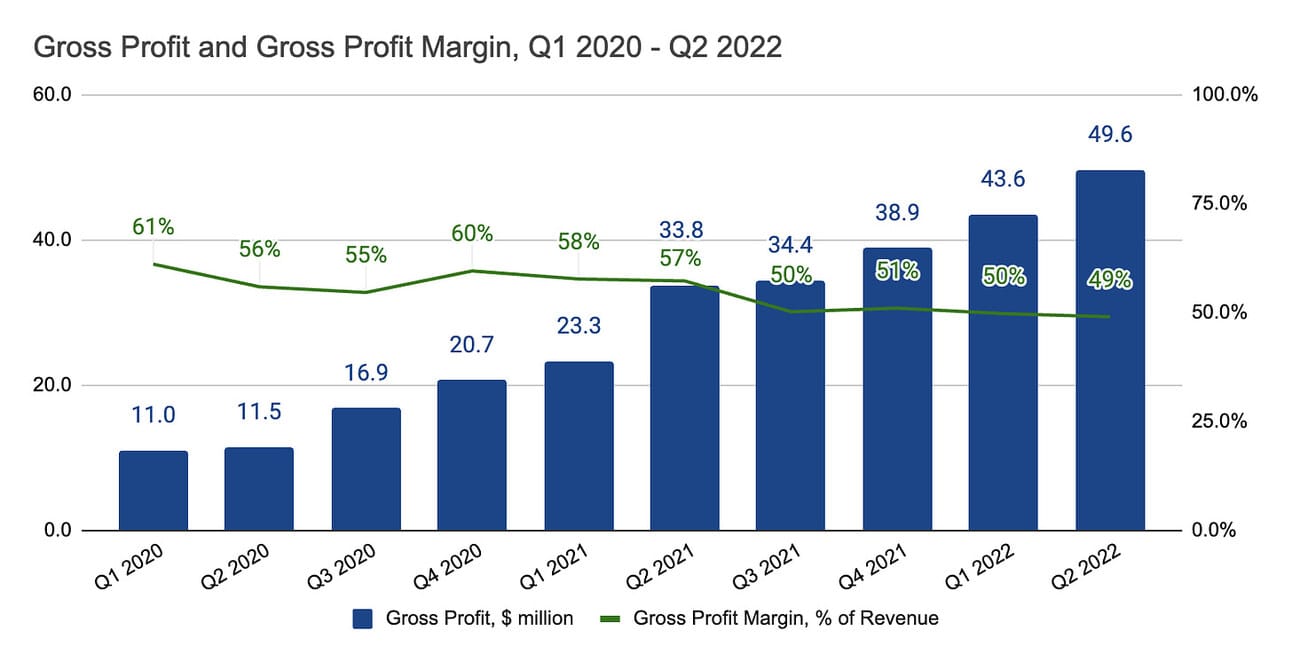 The company’s management does not provide revenue guidance, yet, they reiterated their confidence in ensuring the Net Revenue Retention rate “north of 150%”. NRR rate illustrates the revenue growth for the existing clients over some time. Thus, the NRR of 157%, which the company delivered in Q2 2022, means that the same merchants that generated $59 million in revenue in Q2 2021, generated $92.6 million in revenue in Q2 2022.