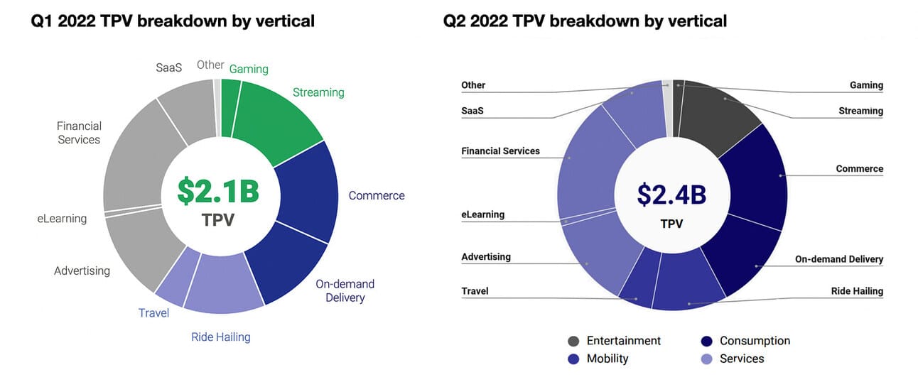 The company has a well-diversified mix of merchants across multiple categories; thus, a slowdown in one category can be compensated by the customers in the growing category. Thus, this time the company’s management mentioned its advertising, travel, commerce, and SaaS customers as the key drivers behind the TPV growth (while previously the growth was driven by ride-hailing, streaming, and financial services). You can see the TPV breakdown by vertical and the dynamic between Q1 2022 and Q2 2022 on the charts below.