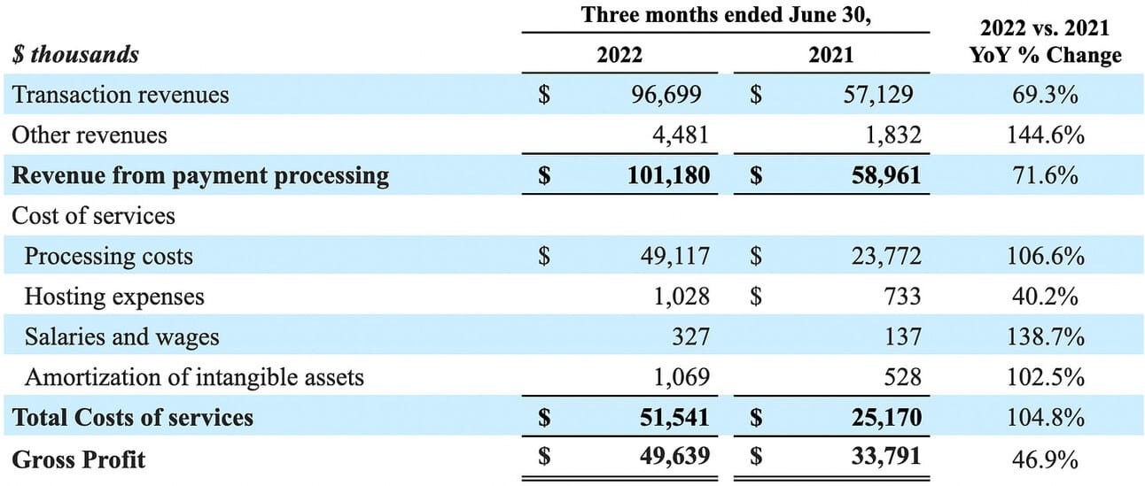dLocal reported $49.6 million in Gross Profit for the quarter, which represents a 46.9% increase compared to Q2 2021. Gross Profit grew at a slower pace than the revenue (46.9% vs. 71.6% YoY), primarily due to escalating processing costs. Thus, the processing costs increase by 106.6% YoY.