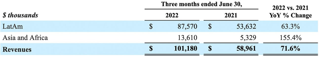 The company reported $101.2 million in total revenue, which represents a 72% growth compared to Q2 2021, and a 16% growth sequentially. The company now operates across 37 countries, with 22 countries outside of Latin America. As can be seen from the table below, the company’s revenue in LatAm grew by 63.3% YoY (and comprised 86% of the total revenue), while the revenue in Asia and Africa grew by 155.4% YoY (and comprised 14% of the total revenue).