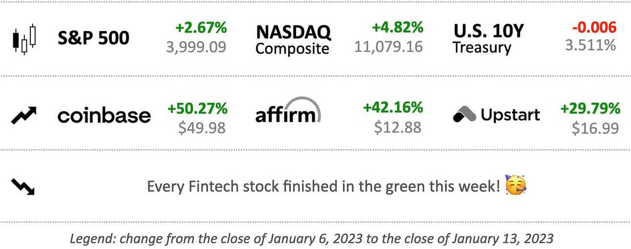 Shares of Coinbase (NASDAQ: ), Affirm (NASDAQ: ), and Upstart (NASDAQ: ) lead this week’s rally. Do you know what’s common about a cryptocurrency exchange, a Buy Now Pay Layer company, and a consumer lender without its own balance sheet? These are some of the most beaten-down Fintech stocks! Before this week’s rally, Coinbase shares were down 90.30%, Affirm shares were down 94.48%, and Upstart shares were down 96.64% from their respective all-time highs. Coinbase also announced a second round of layoffs impacting 20% of the company’s workforce (more on that below).
