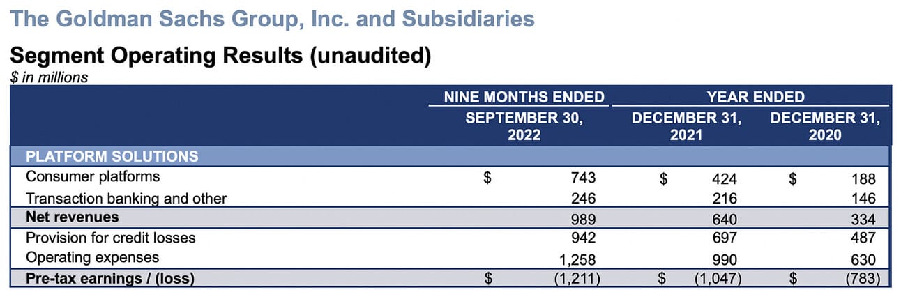 In Q3 2022, Goldman Sachs (NYSE: ) announced the plan to restructure its consumer banking business, Marcus by Goldman Sachs. Thus, consumer-facing products, such as personal loans and high-yield savings accounts, would be incorporated into the “Asset & Wealth Management” segment, while the partnerships with Apple and GM, as well as GreenSky business, would form a new segment “Platform Solutions”. Previously, Marcus’ results were reported under the “Consumer & Wealth Management” segment, so it was difficult to dissect the true performance of this business. However, on Thursday, Goldman Sach released preliminary Q4 2022 results of its new segments, including “Platform Solutions”…