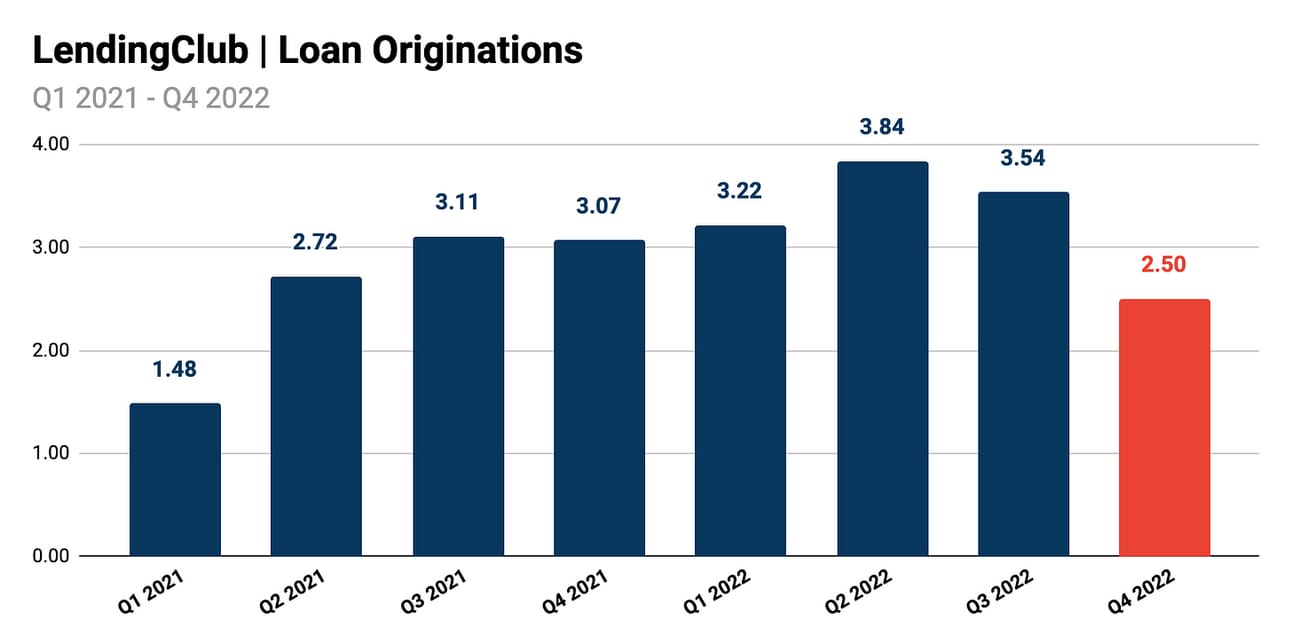 LendingClub (NYSE: ), a pioneer in online lending, announced laying off 225 employees, or 14% of the company's workforce. "These measures enable us to more closely align our expense structure to loan volume and revenue, while ensuring effective execution against our strategic priorities and long-term vision," commented Scott Sanborn, the company's CEO, in the press release. The company also pre-announced Q4 2022 results, reporting a decline in origination volumes from $3.54 billion in Q3 2022 to $2.50 billion in Q4 2022. LendingClub will report its Q4 2022 results at the end of January, but, similar to Q3 2022, I would expect the decline in origination volumes to come from weaker demand for marketplace loans.