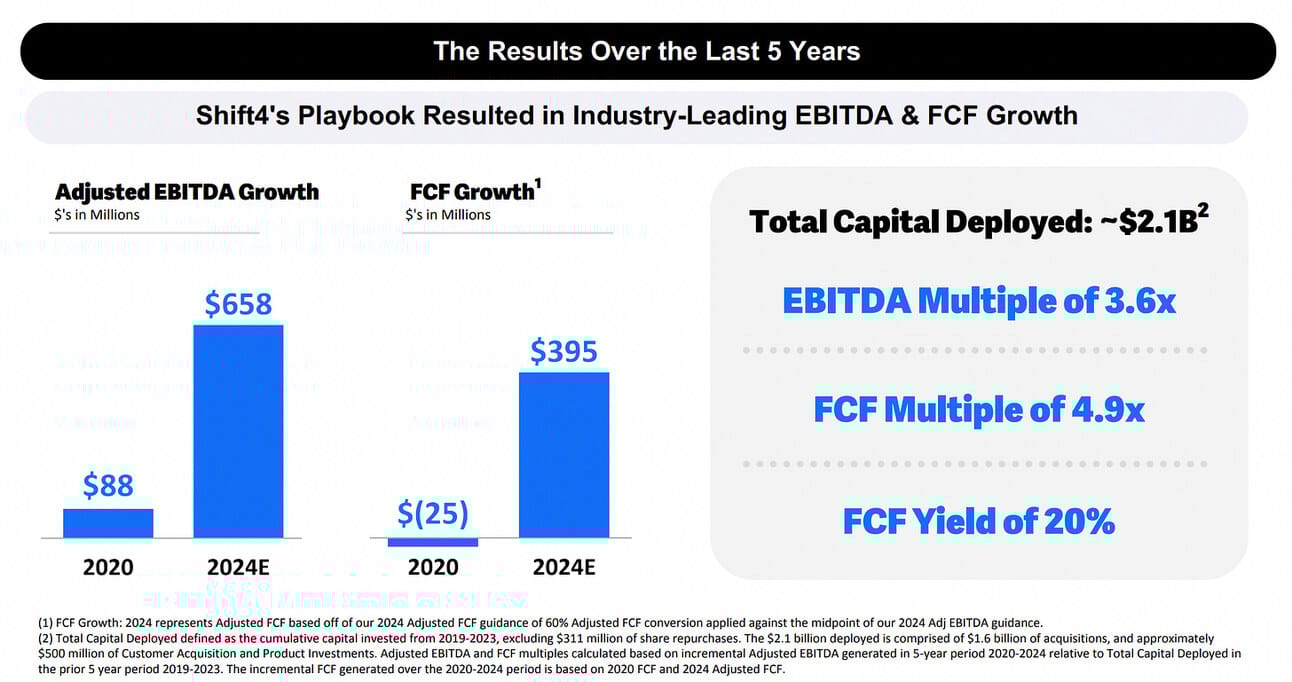 But back to Shift4…Shift4 “deployed” $2.1 billion in capital during the 2019-2023 period ($1.6 billion in acquisitions + $0.5 billion in product development and marketing). As a result, Adjusted EBITDA increased from $88 million in 2020 to $658 million in 2024 (per the company's guidance), and Free Cash Flow increased from negative $25 million in 2020 to $395 million in 2024 (again, per the company's guidance).