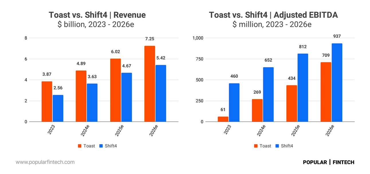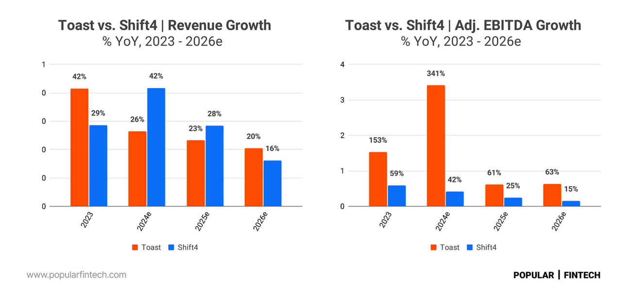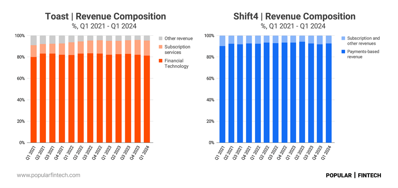 Shift4 and Toast represent one of the most fascinating rivalries in the payments industry. They recently started diversifying their businesses, but in the beginning, both provided POS software, payment terminals, and payment processing for restaurants. Both did a fantastic job at this as their growth trajectory suggests.