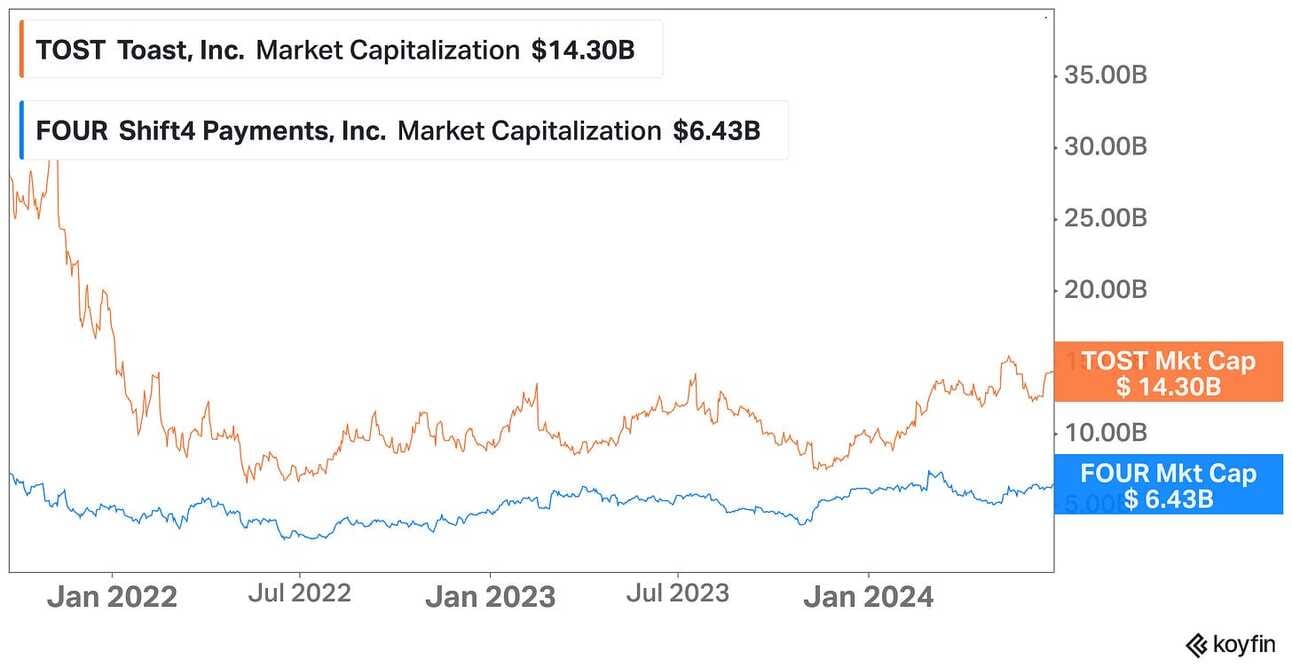 The market might be valuing Toast as a software company, while putting Shift4 into the payments bucket. However, this begs a question: what prevents Shift4 from using Toast’s playbook and acquiring a bunch of software companies to extend its product offering? The Shift4 team knows how to play the M&A game, and they certainly know how to upsell merchants.