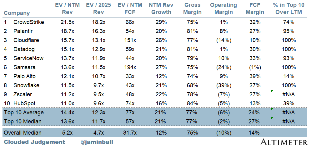 According to the data from the Clouded Judgement newsletter, the median EV/NTM Revenue multiple for software companies is 5.2x, while the top 10 companies trade at a median multiple of 13.6x. The median revenue growth for all software companies is projected to be 12% YoY, while the top 10 companies are expected to growth revenue at a median rate of 21% YoY.