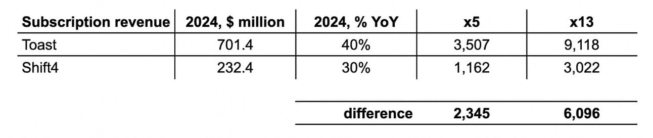 So my conclusion is that Toast’s future growth drivers (new segments, international expansion) are still early and yet to be proven, while for Shift4 those are already a reality. Don’t get me wrong, I don’t doubt that Toast can deliver on its promises. But at the same time, I think Shift4's 3-5 year projections are more tangible.