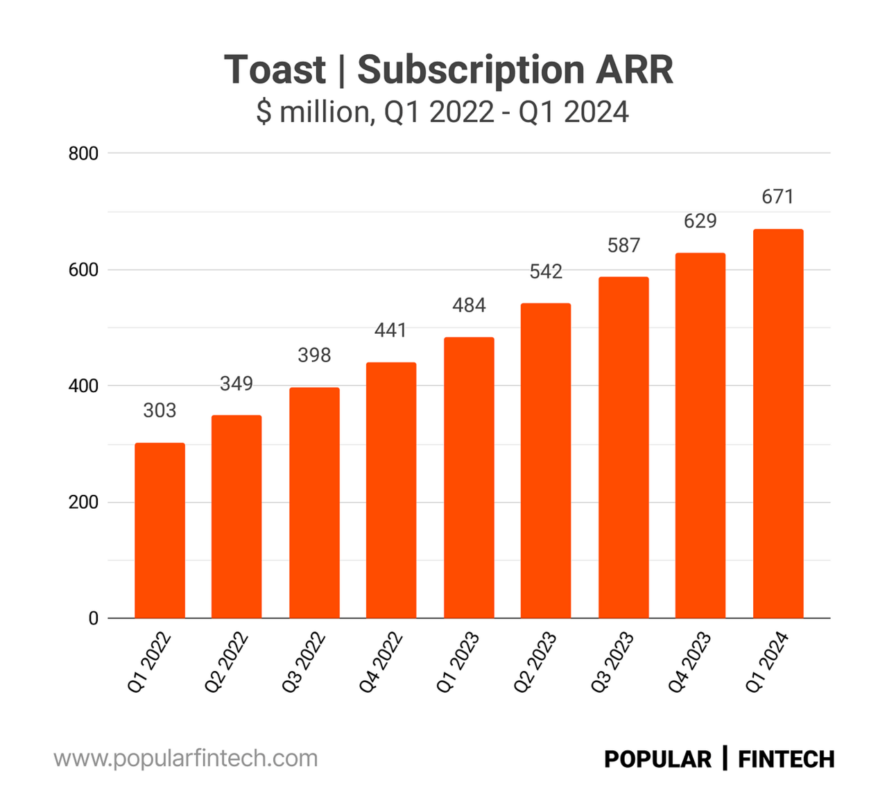 Toast even reports Subscription ARR (Annual Recurring Revenue) as other software companies (they also report Financial Technology ARR, which is annualized gross profit from payments and lending revenue, but I never understood the meaning of this metric). In Q1 2024, Toast reported $671 million in Subscription ARR, an increase of 39% compared to Q1 2023.