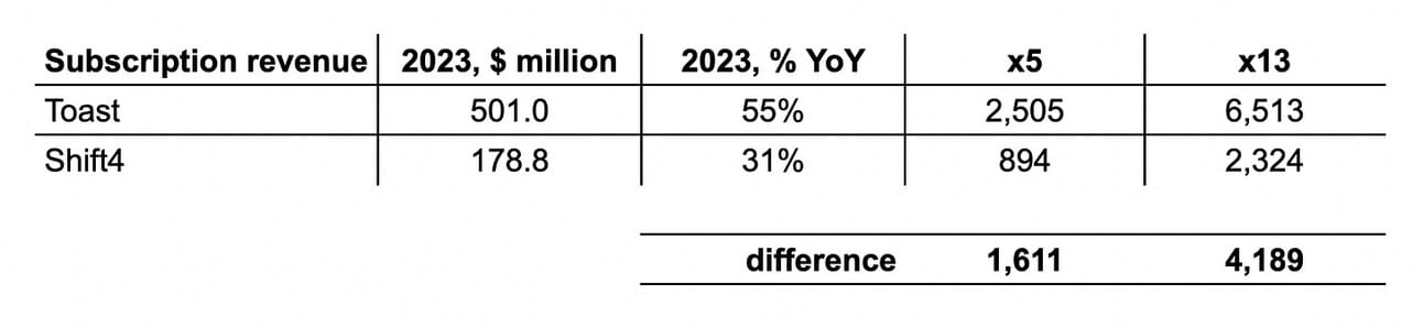 Applying these multiples to Toast’s and Shift4’s 2023 “subscription revenue” suggests that the software component might be responsible for a $1.6 - 4.2 billion difference in valuation….which still does not (fully) explain the $5.5 billion difference in the enterprise values of Toast and Shift4.