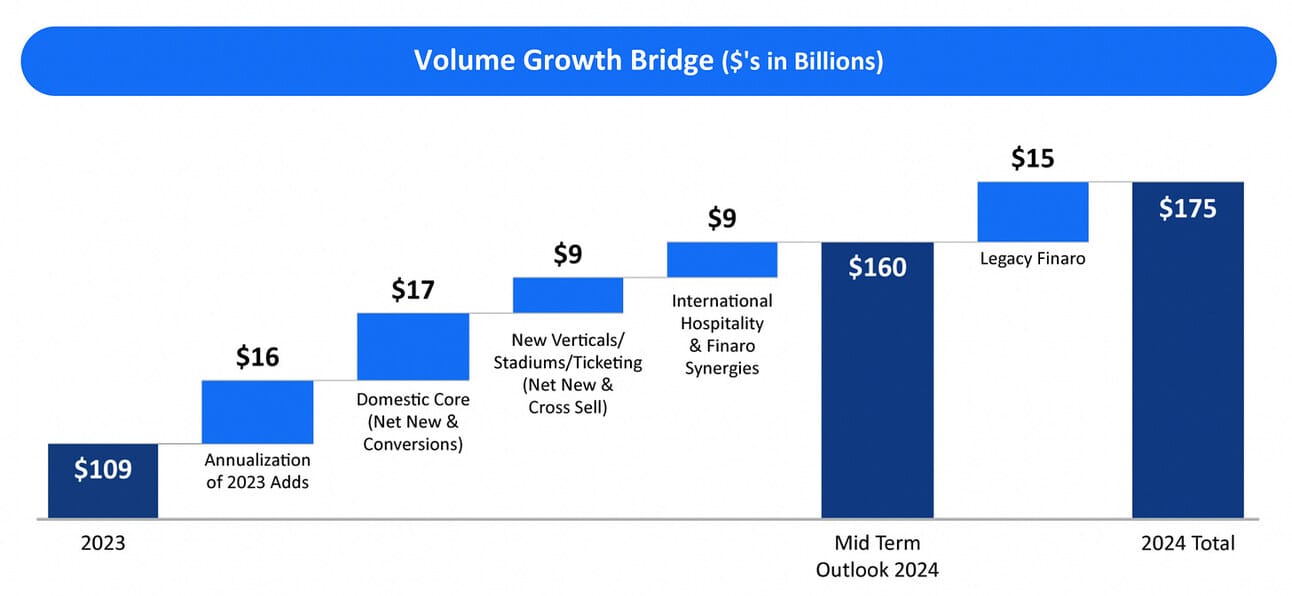 In Q3 2023, Shift4 provided a “volume growth bridge” (see below) quantifying the expected contribution of new verticals and international markets to the payment volume. As you can see, new verticals and international markets were expected to have a meaningful contribution to the company’s growth in 2024. Importantly, this “bridge” was provided before the Revel and Vectron acquisitions!