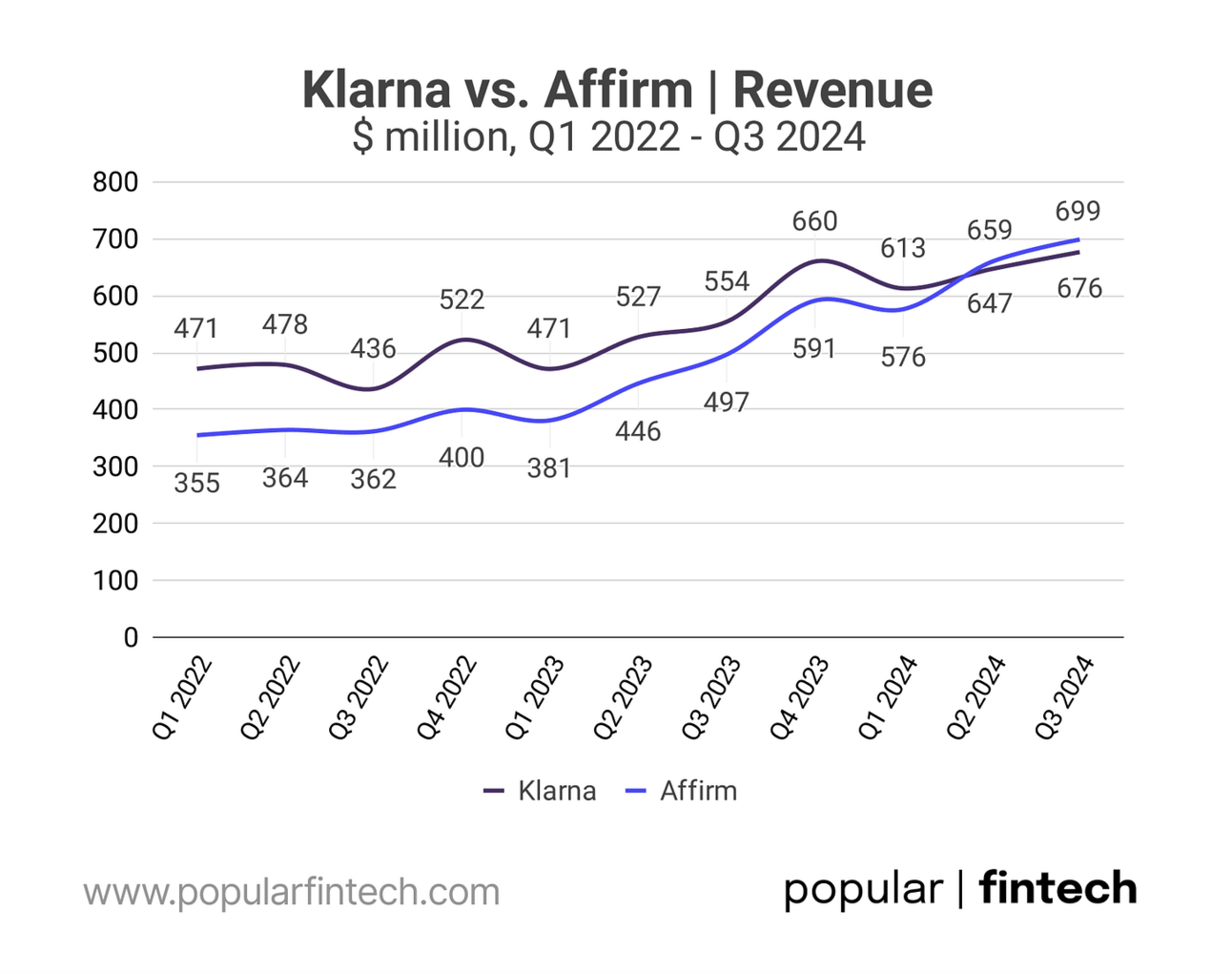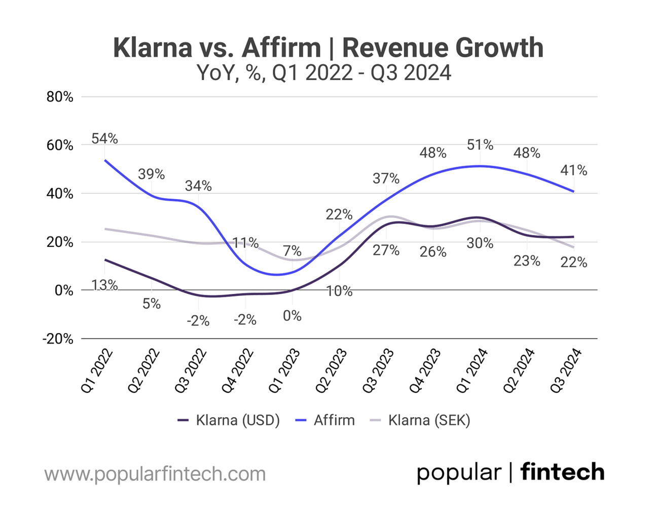 …but before we begin the comparison, it is important to note that Klarna reports its financials in Swedish Kronor (SEK). I used average quarterly SEK/USD exchange rates to convert Klarna’s numbers to U.S. dollar.