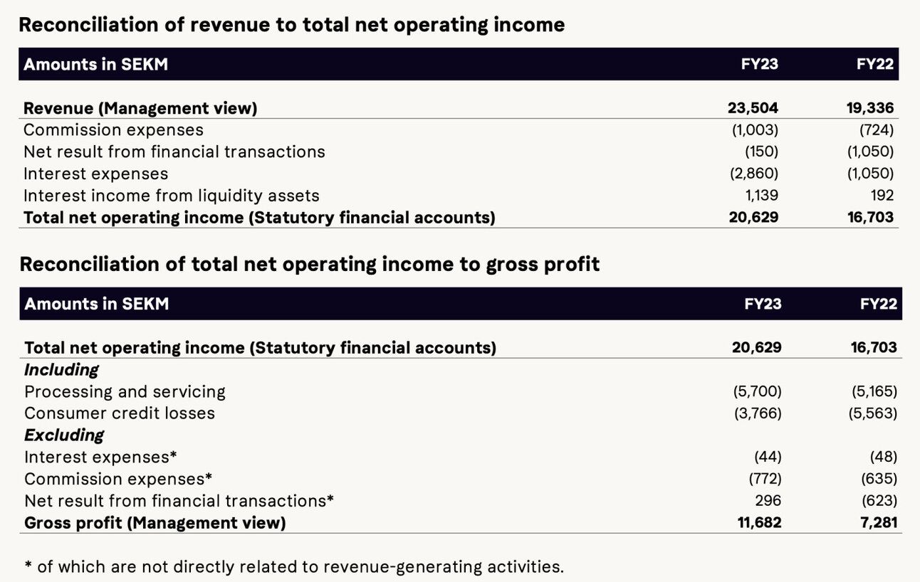Also, Klarna is a bank registered in Sweden. The company’s management provides gross revenue and gross profit numbers, but some disclosures are available only on the “net revenue” level (reported as “net operating income”).