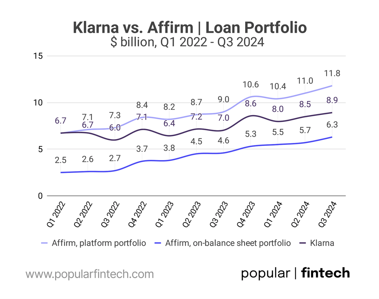 At the end of Q3 2024, Klarna had $8.9 billion in loans on its portfolio, compared to $6.3 billion for Affirm. Affirm also reports the "platform portfolio," which includes loans it originated and sold to investors, but continues servicing. Affirm’s “platform portfolio” stood at $11.8 billion at the end of Q3 2024.