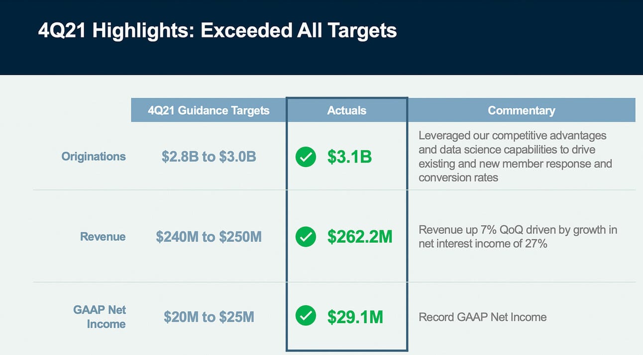 LendingClub Corporation ( ) held its Q4 2021 earnings call this week (January 26, 2022). The company completed acquisition of Radius Bank on February 1, 2021, so this earnings call illustrated the first (almost) full year of operations under the banking model. The company exceeded its own guidance on originations, revenue and income, delivering another strong quarter and outstanding full year results.