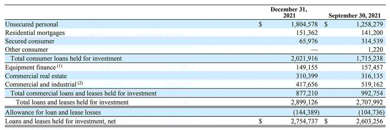 It should be noted that Radius Bank had a loan portfolio prior to acquisition, but the key driver for the interest income in 2021 were consumer loans generated by LendingClub. The breakdown below illustrates that “Unsecured personal loans” generated $60.4 million (or 72%) out of total net interest income of $83.1 million.