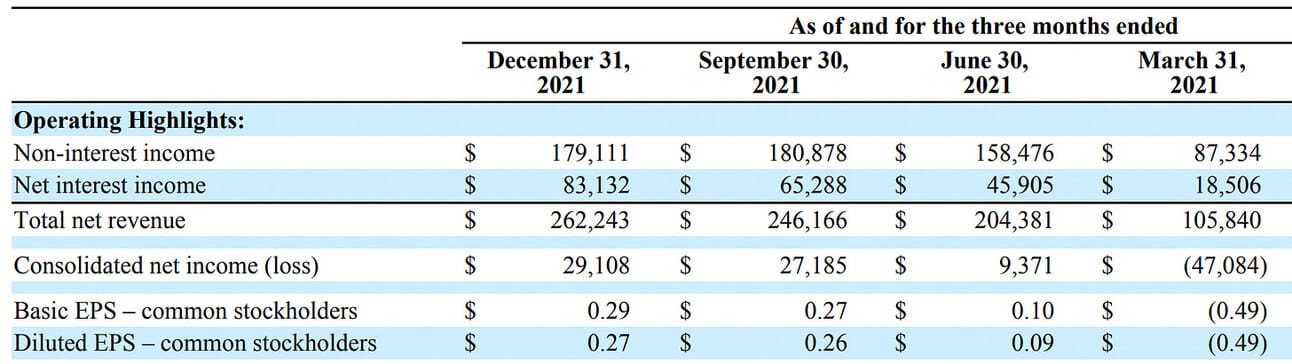 As the result of recovering origination volumes to pre-pandemic levels, as well as increasing net interest income, LendingClub managed to generated net income for the first time in company’s history. Thus, the company generated $29.1 million in net income in Q4, 2021, and $18.6 million for the full 2021.