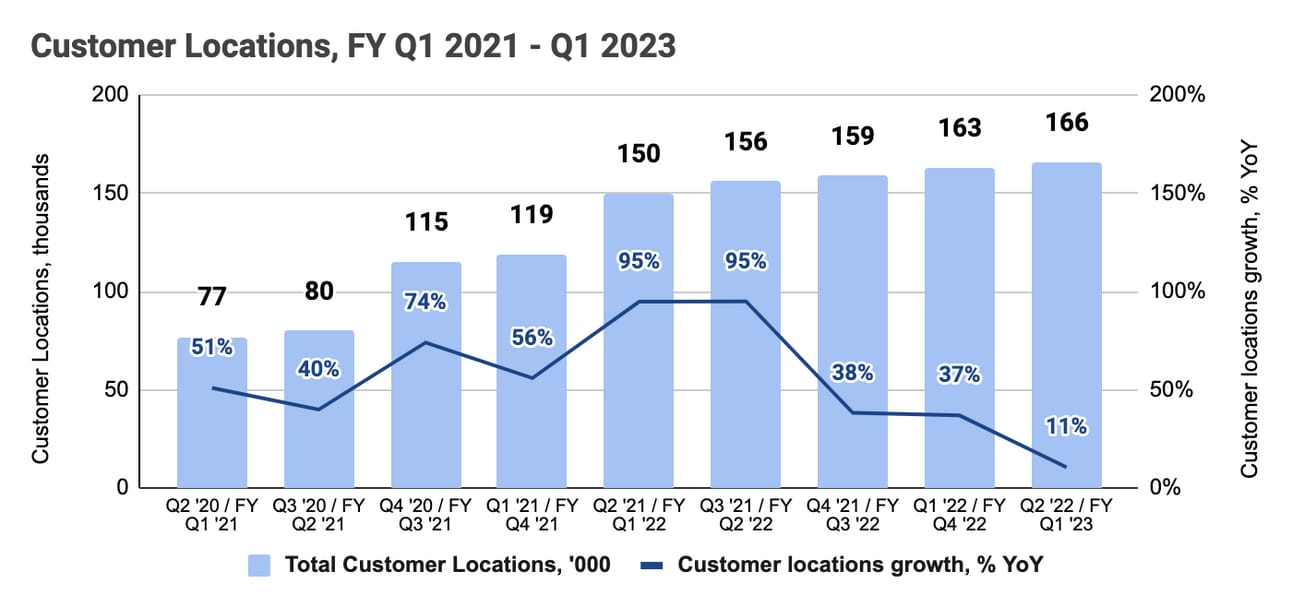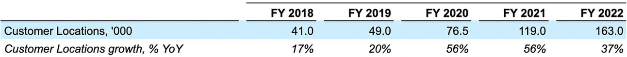 One of the key operating metrics for Lightspeed is “customer locations”. The company defines “Customer Location” as “a billing merchant location for which the term of services has not ended, or with which we are negotiating a renewal contract.” Lightspeed grew customer locations at a Compound Annual Growth Rate (further in the text just CAGR) of 41% during the Fiscal 2018-2022 period, reaching 163,000 locations by the end of Fiscal 2022.