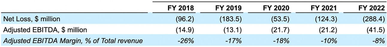 The company has been reporting an operating loss for the past 5 fiscal years, as operating expenses exceeded the gross profit. In Fiscal 2022 the company reported $589.5 million in operating expenses, which resulted in a $318.3 million operating loss. Note that the operating margin declined from negative 38% in Fiscal 2018 to negative 58% in Fiscal 2022 driven by compressing gross profit margins, rising share-based compensation, and accumulating amortization expenses from the acquisitions.