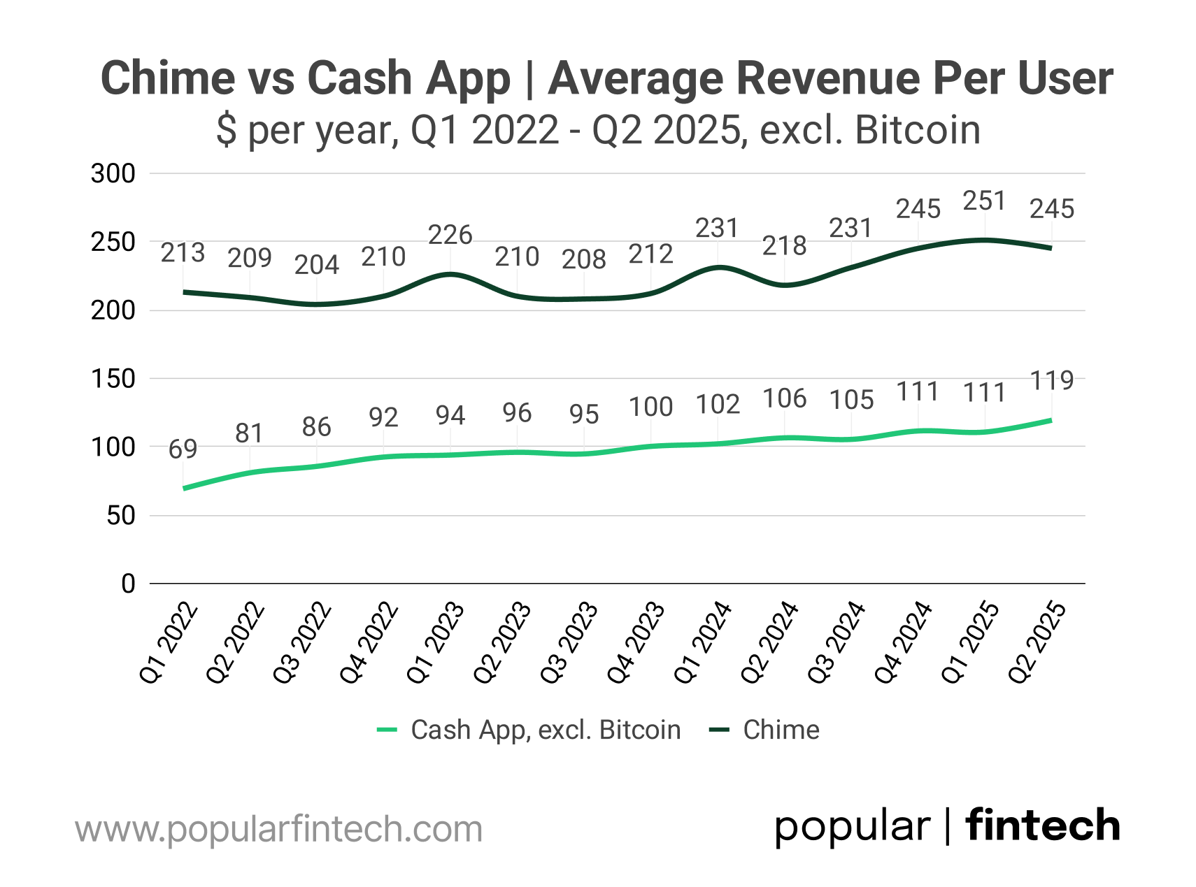 Having more primary banking relationships means Chime can earn more from each customer, without carrying millions of low-value active users. With 67% of its users in this category versus just 20% for Cash App, Chime generates substantially higher revenue per customer. In Q2 2025, Chime’s average annualized revenue per user reached $245, more than double Cash App’s $119.