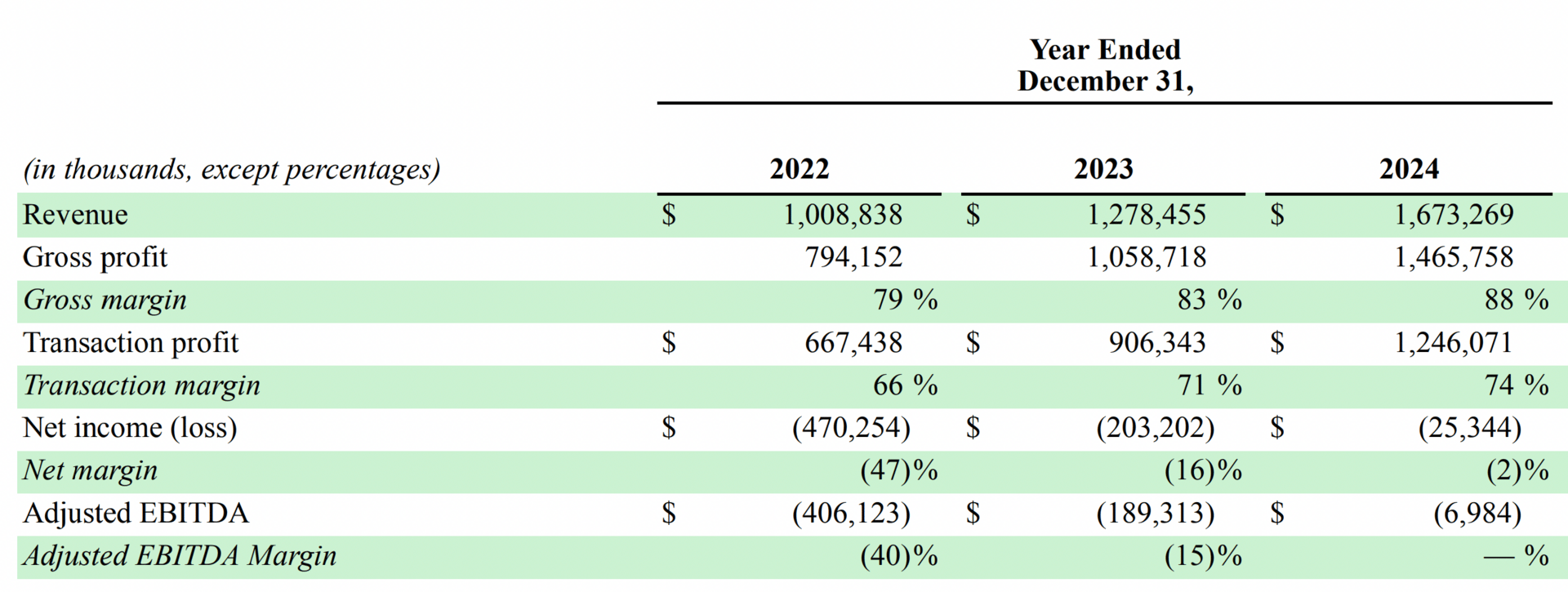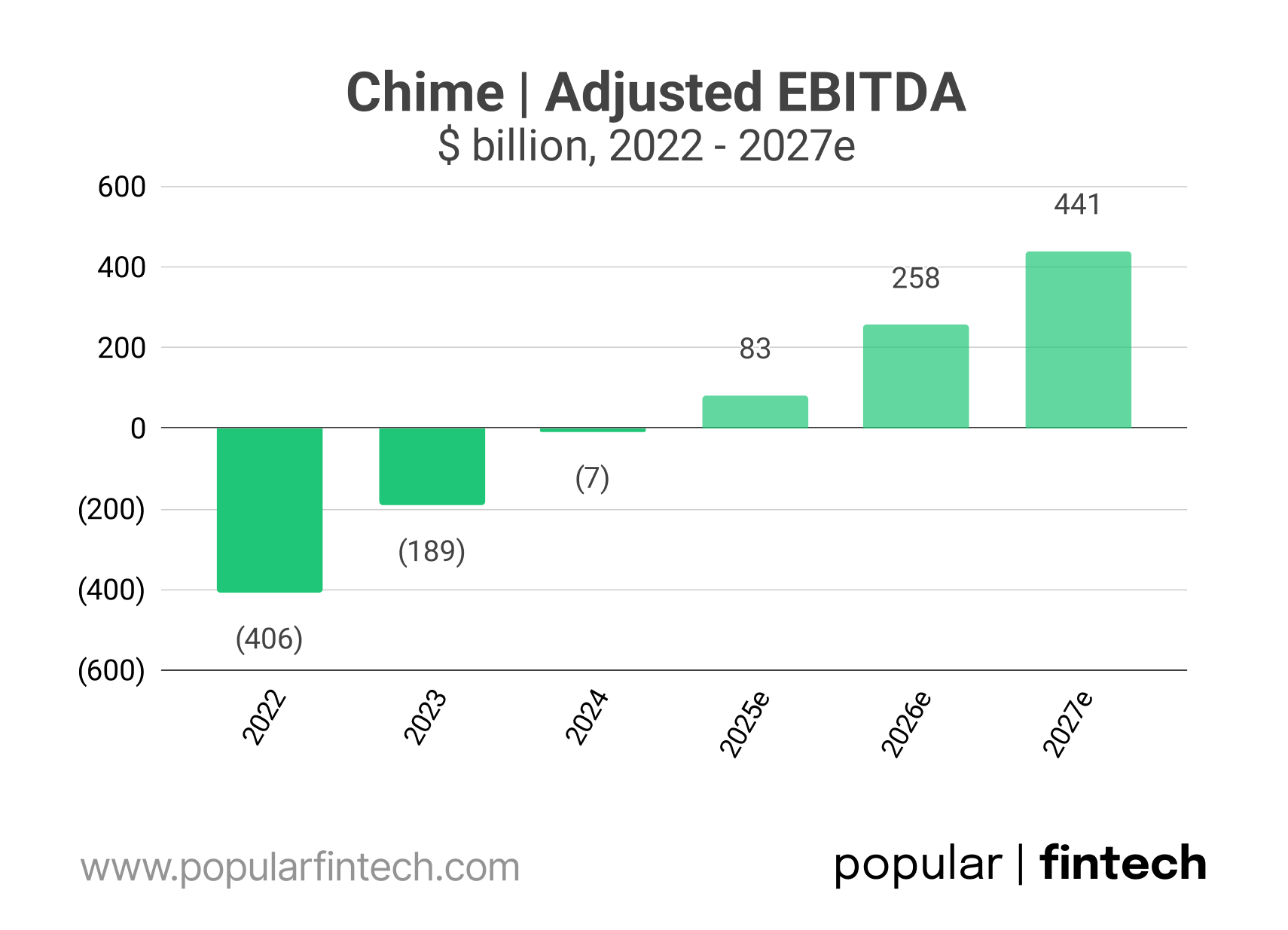 Chime now serves more than 8 million people, and generated $1.6 billion in revenue in 2024 (up 31% YoY) and $1.46 billion in gross profit (up 38%), while reporting negative adjusted EBITDA and a net loss. The company is at a magical moment where it is about to hit profitability, on an adjusted basis, for now.