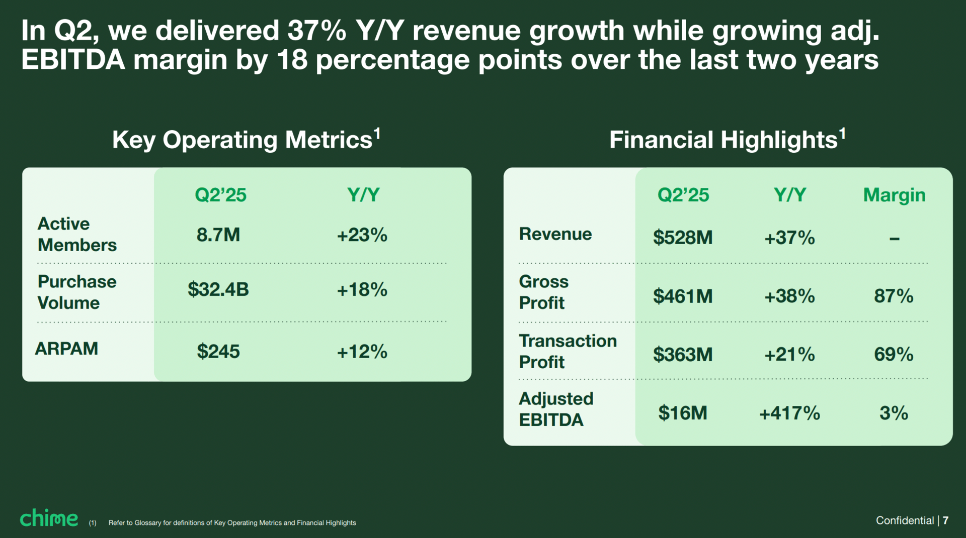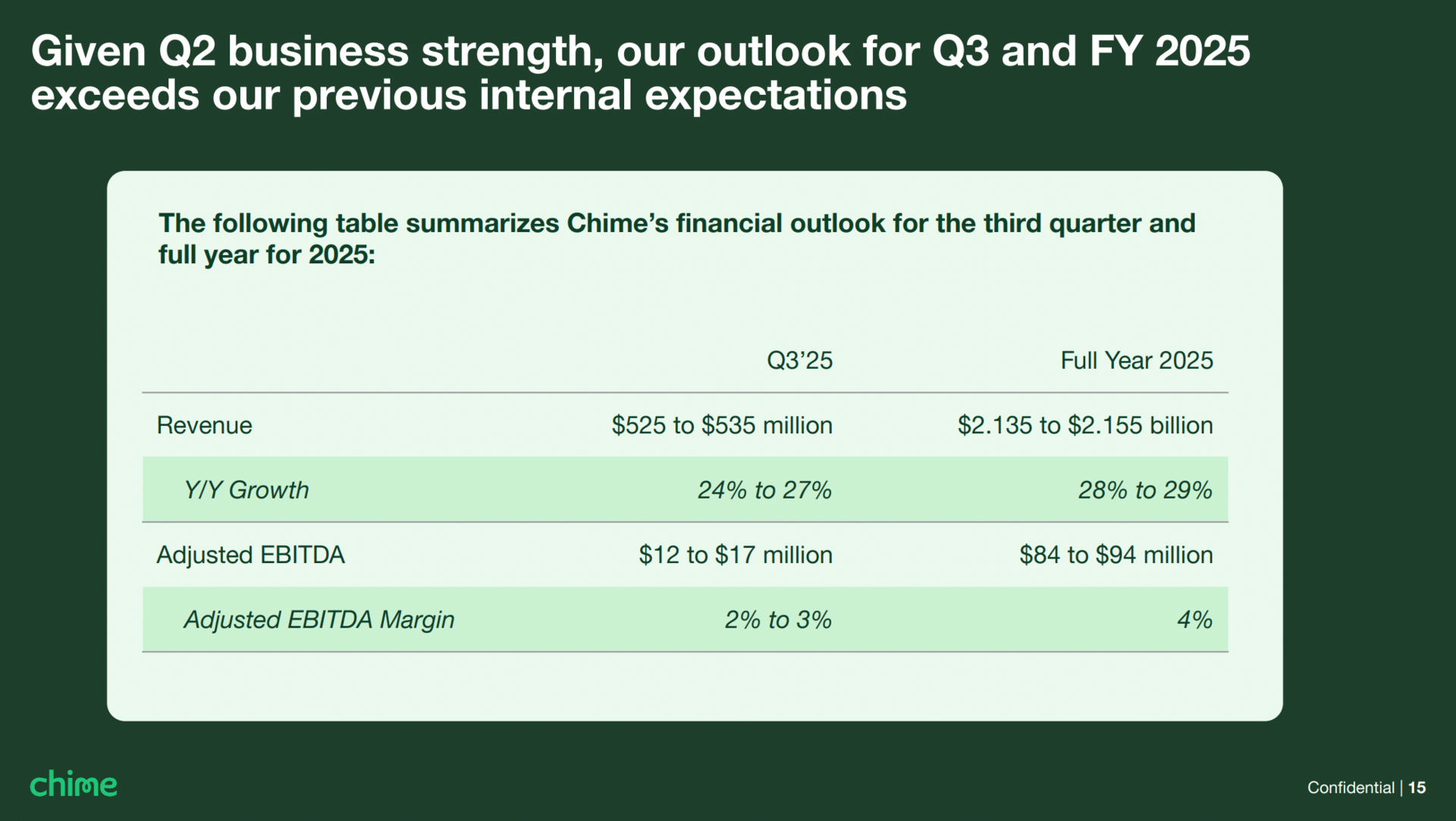 Guidance for 2025 points to 28-29% revenue growth and $84-94 million in adjusted EBITDA, which would make this Chime’s first profitable year on an adjusted basis.