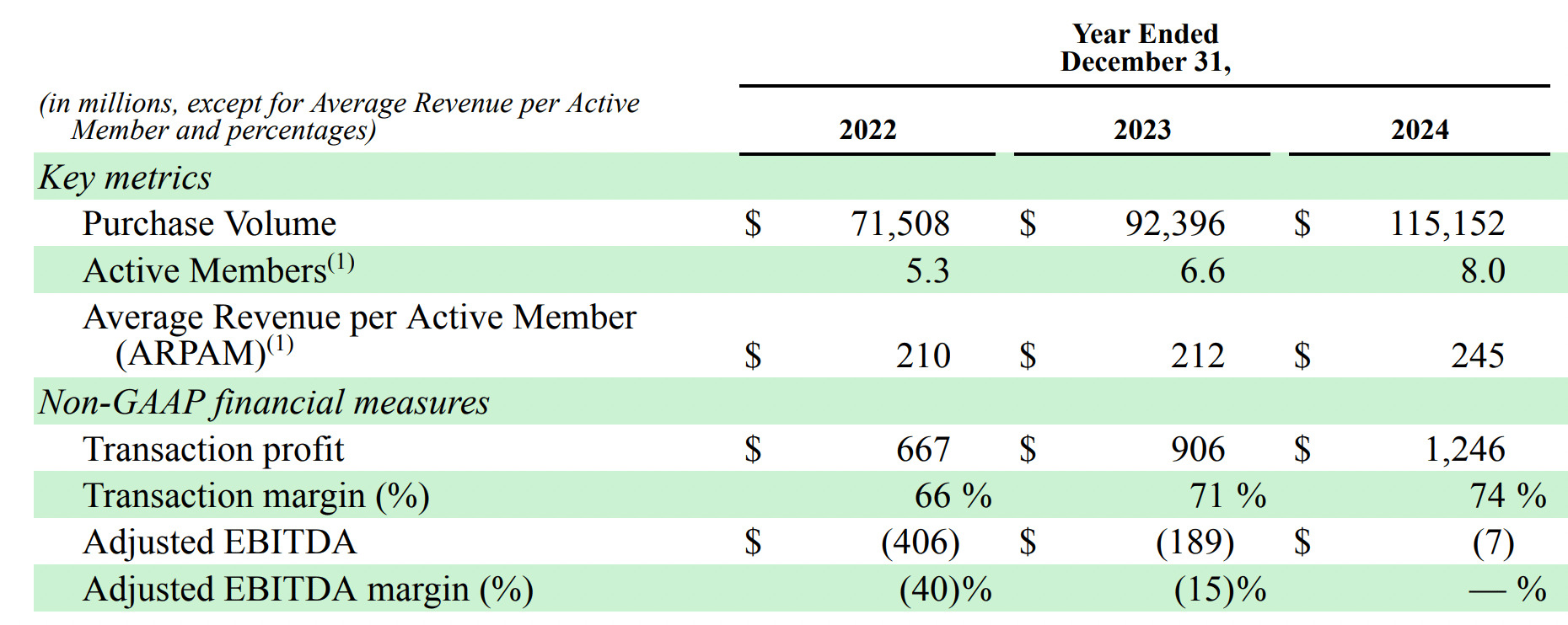 Investors should be watching three metrics closely: active users, average revenue per user, and transaction margin (gross profit after credit and transaction losses). For now, the company is improving profitability and targets a 35% adjusted EBITDA margin in the steady state, though there is still a long road ahead to get there.