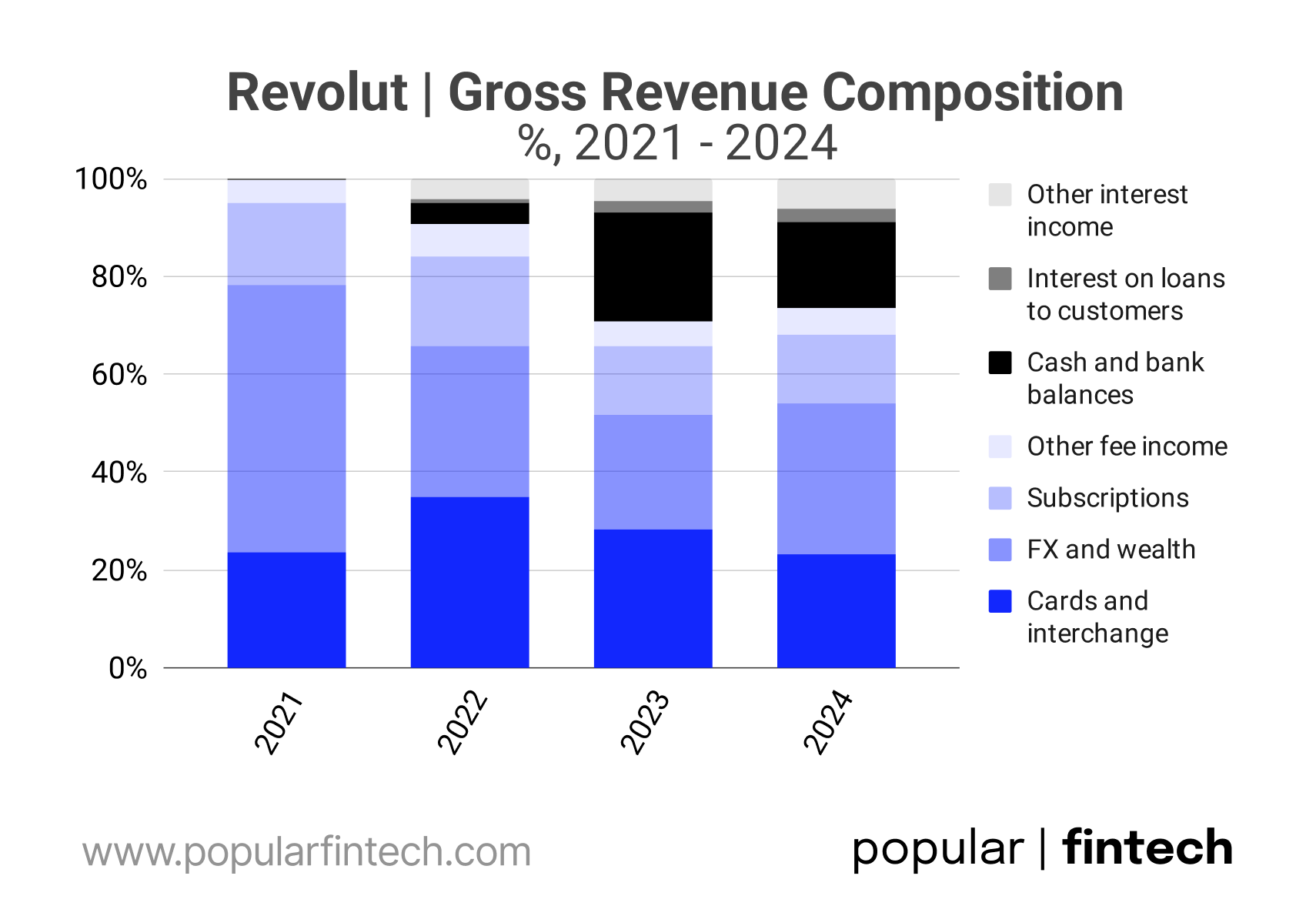 Nubank and Revolut take fundamentally different approaches to making money. Revolut’s business model is fee-driven. Its gross revenue primarily comes from card and interchange fees, foreign exchange services, wealth products like stock trading, and paid subscriptions.