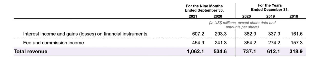 Nubank surpassed $1B in revenue in the first nine months of 2021. The revenue doubled over the last year and the growth came from both Interest income (income that is driven by the size of the loan book that builds over time) and Fee and commission income (income that is driven by customer activity during the reporting period).