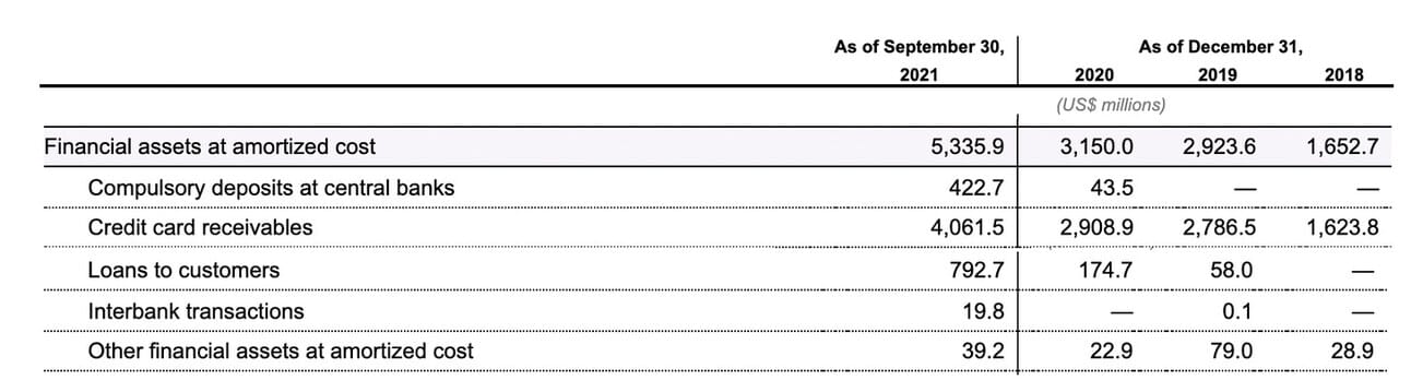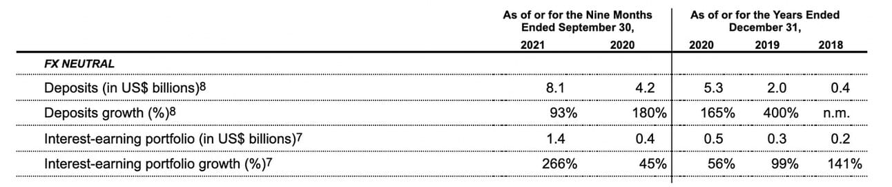 At the end of September 2021, Nubank had $8.1B in deposits, and $4.85B in its lending portfolio (of which $4,061.5M in Credit card receivables, and $792.7M in Loans to customers); $1.4B were interest-bearing assets. The difference between the lending and deposit portfolio indicates that the company does not have capital constraints in its lending business. Nevertheless, scaling the lending business will require time and, perhaps, a wider product range (i.e. car leasing, mortgages).