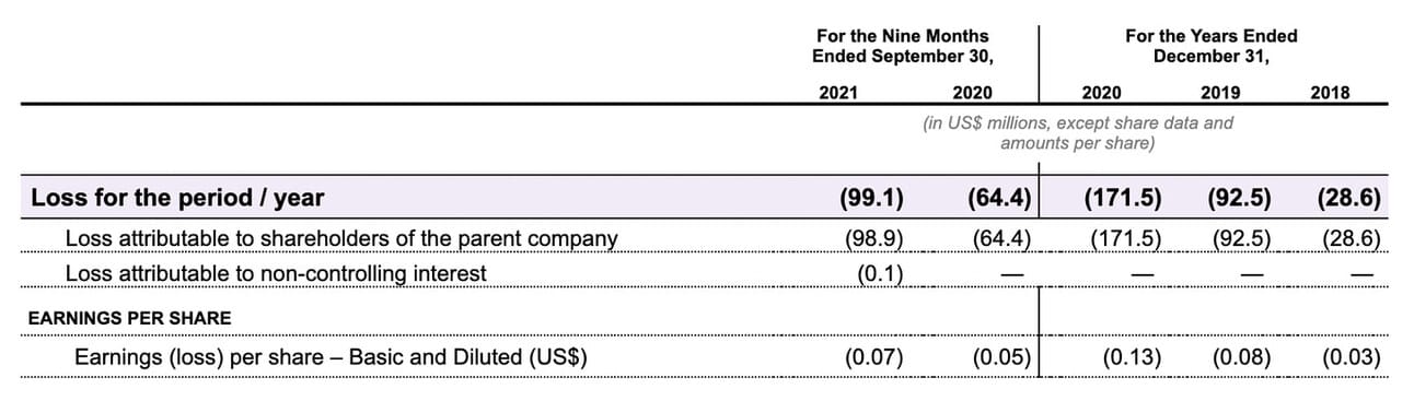 The company made losses in all three full reported years (2018-2020), as well as the first nine months of 2021. Thus, the company lost $99.1M in 9M 2021 and $206.2M over the last 12M (Q4 2020 - Q3 2021).